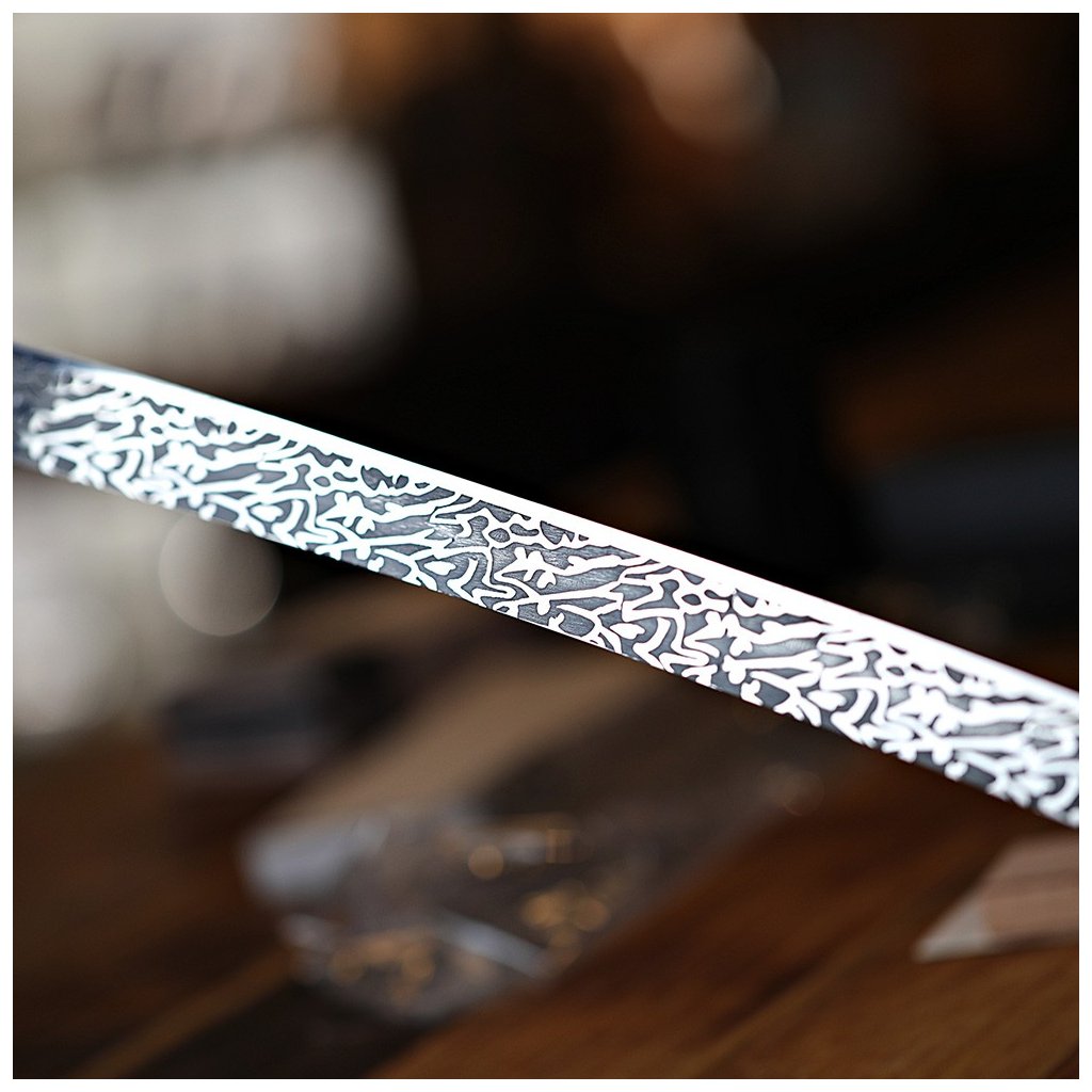 Tato kovaná replika katana typu shinogi-zukuri je vyrobena z prověřené uhlíkové oceli AISI 1045. Jako esteticky hodnotná replika meče katana v naší nabídce vyniká tento model vizuálně atraktivní 3D imitací damaškového vzoru na čepeli. Meč najde své uplatnění jako dekorace, ale je vhodný i pro aktivní nácvik technik bojových umění. Vzhledem k absenci parciálního kalení a tvrdosti 48 HRC je tato sportovní replika určena pro studium forem a pohybů, nikoliv pro sekání tvrdých materiálů. Robustní konstrukce s rukojetí potaženou pravou rejnočí kůží zajišťuje autentický pocit při manipulaci.