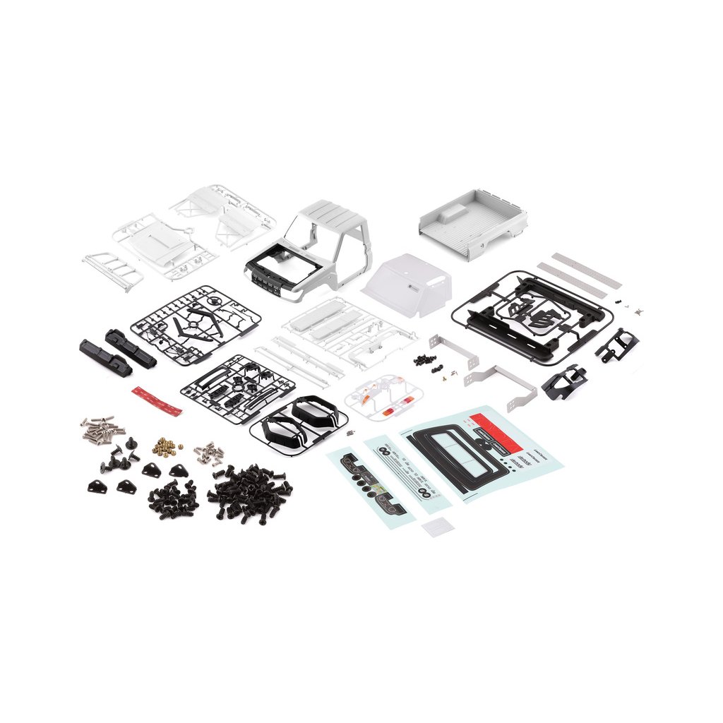 Balení s karosérii Toyota Land Cruiser 70 obsahuje tyto součásti: kabinu, nákladový prostor, chromované díly, světlomety, přední nárazník, vstupy vzduchu, zrcátka, lexanové zasklení kabiny, volant, stěrač, potřebné příslušenství k sestavení, archy samolepek – na karosérii, přístrojovou desku, obrázkový návod…