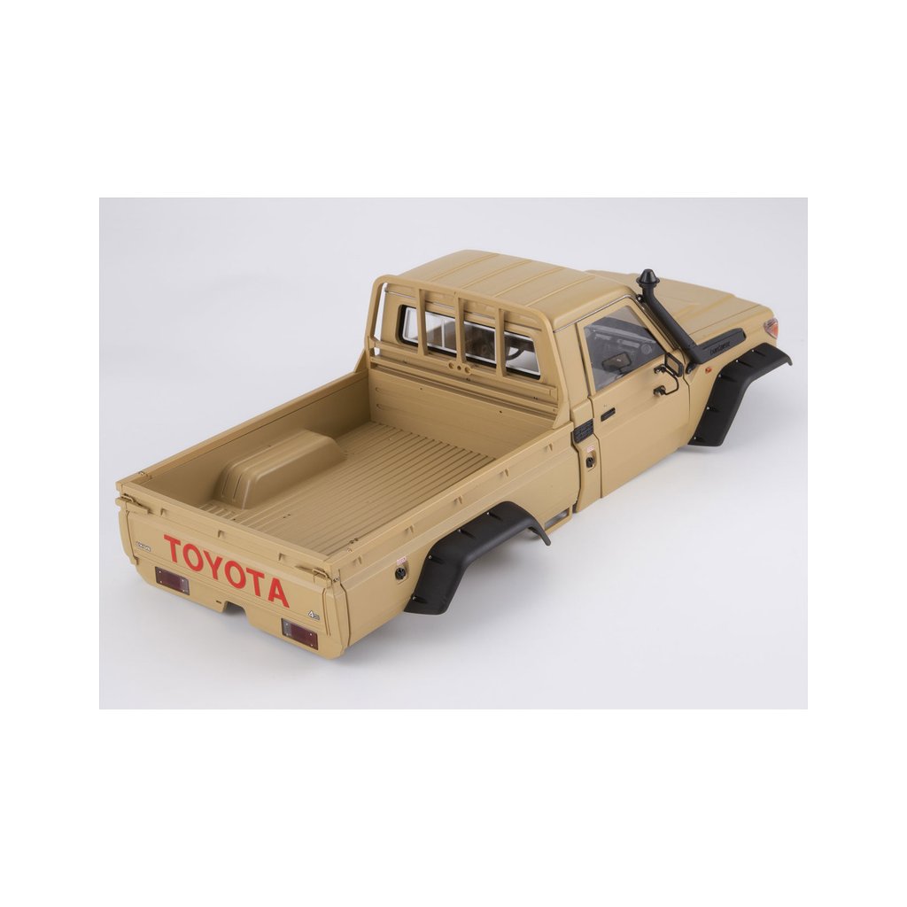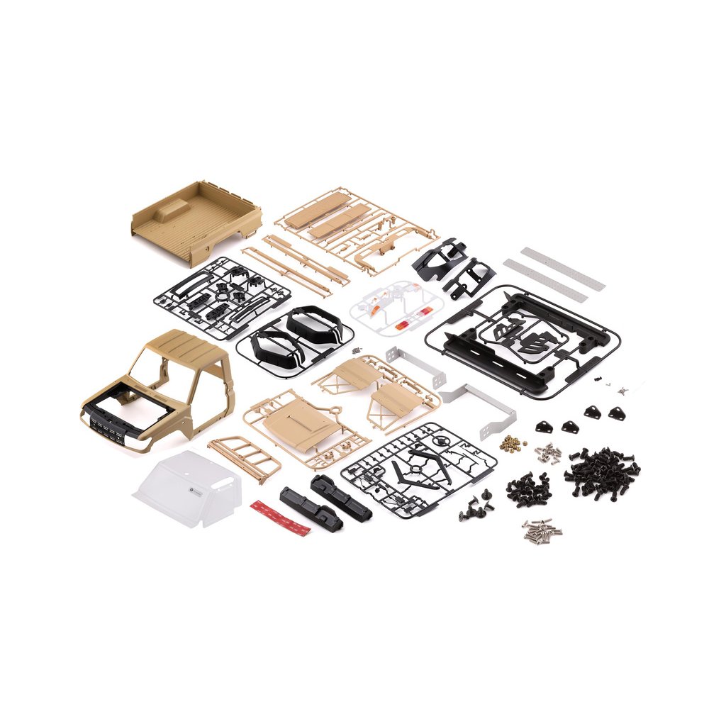 Balení s karosérii Toyota Land Cruiser 70 obsahuje tyto součásti: kabinu a nákladový prostor v pískovém provedení, chromované díly, světlomety, přední nárazník, vstupy vzduchu, zrcátka, lexanové zasklení kabiny, volant, stěrač, potřebné příslušenství k sestavení, archy samolepek – na karosérii, přístrojovou desku, obrázkový návod…