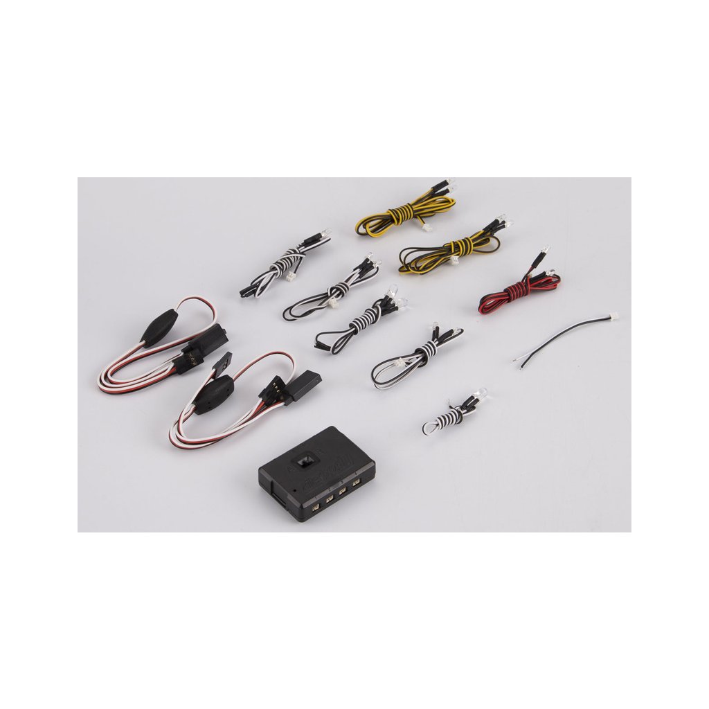 Balení obsahuje: řídící jednotku, 2 x 3 oranžové LED diody, 1 x 2 červené, LED diody, 5 x bílé LED diody celkem 9 ks, 2 x Y-kabely - Rx/servo, Rx/regulátor. Originální a český návod.