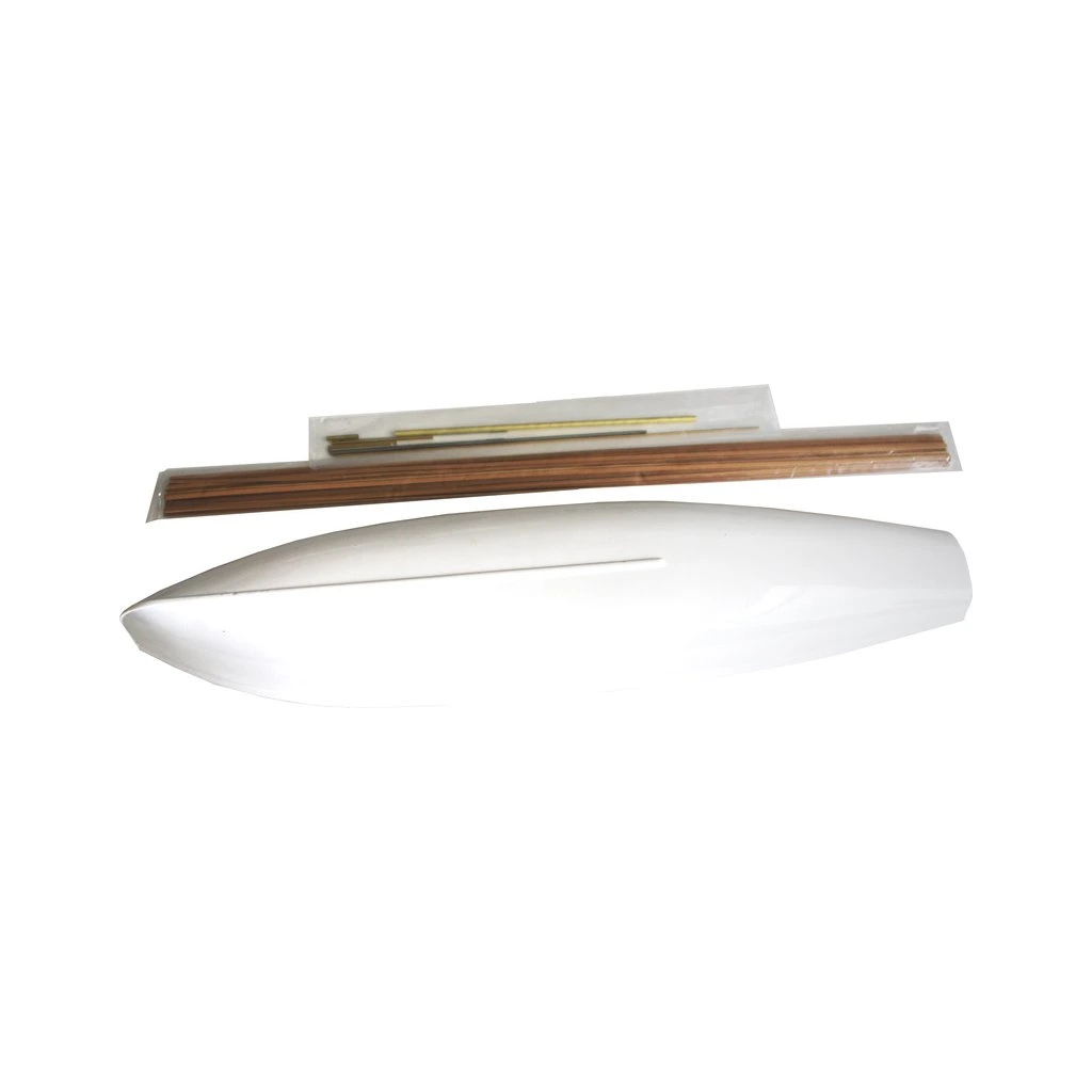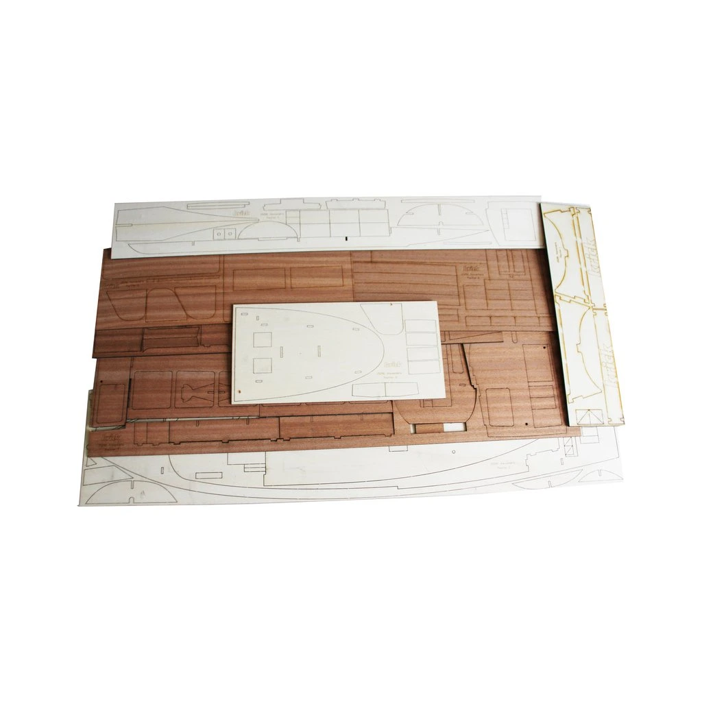 Po otevření víka krabice naleznete plastový ABS výlisek trupu, dřevěné díly modelu z překližky, sadu lišt, drobné součásti uzavřené v sáčcích, sadu výkresů a manuál.