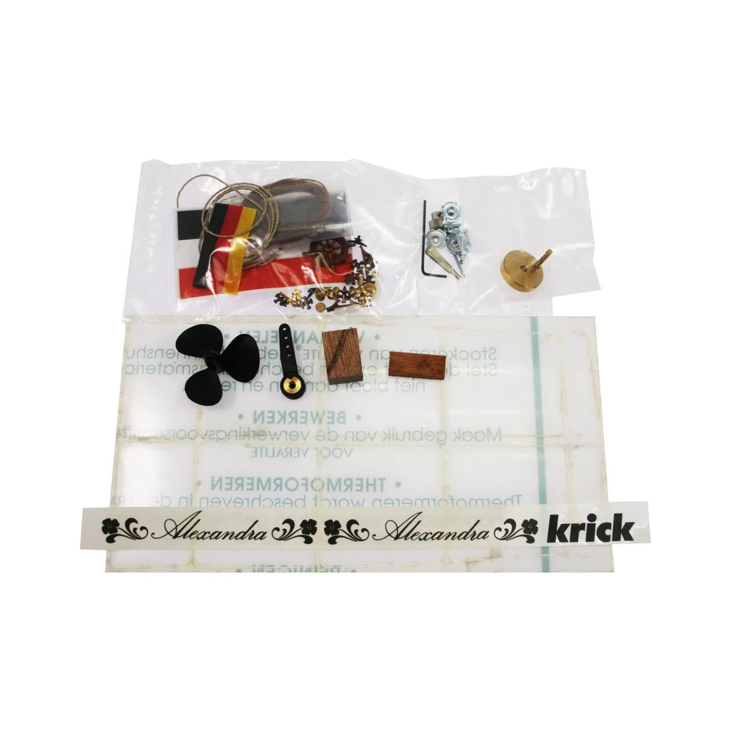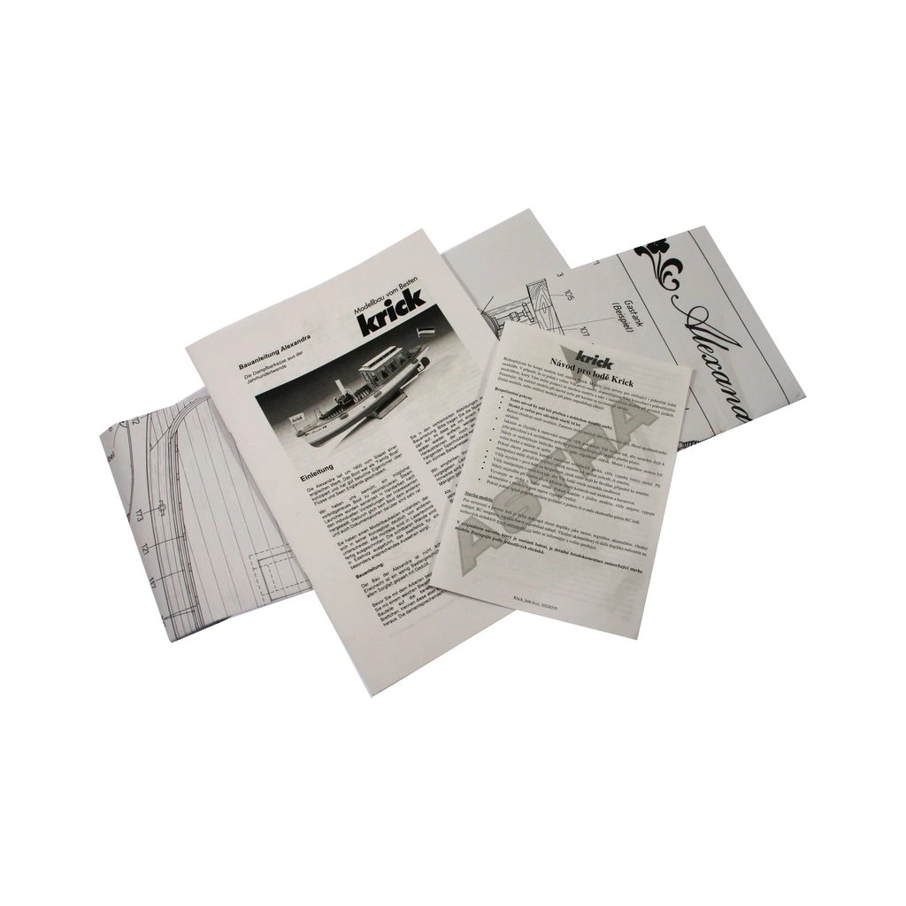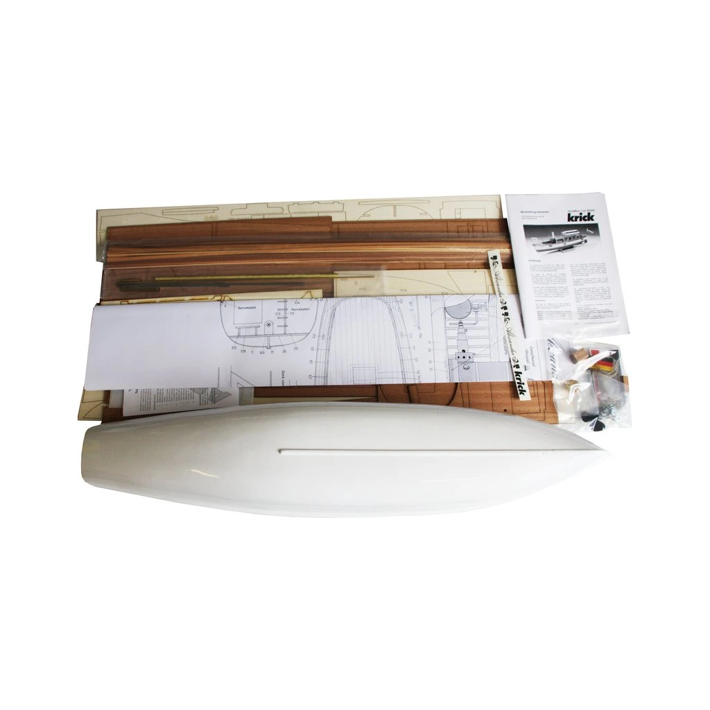 Stavebnice modelu lodi Krick Alexandra obsahuje plastový ABS výlisek trupu, dřevěné díly paluby, montážní součásti, německý manuál a pokyny k provozu.