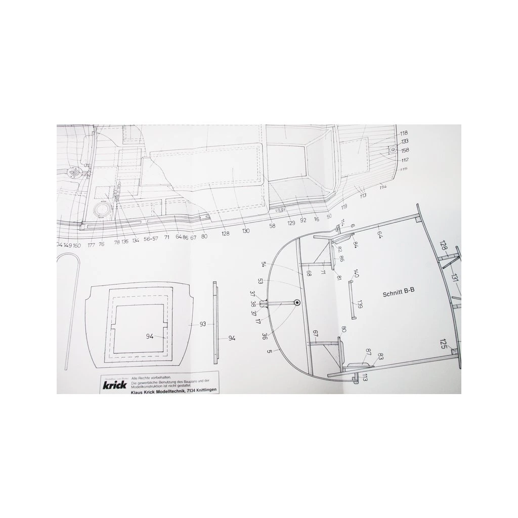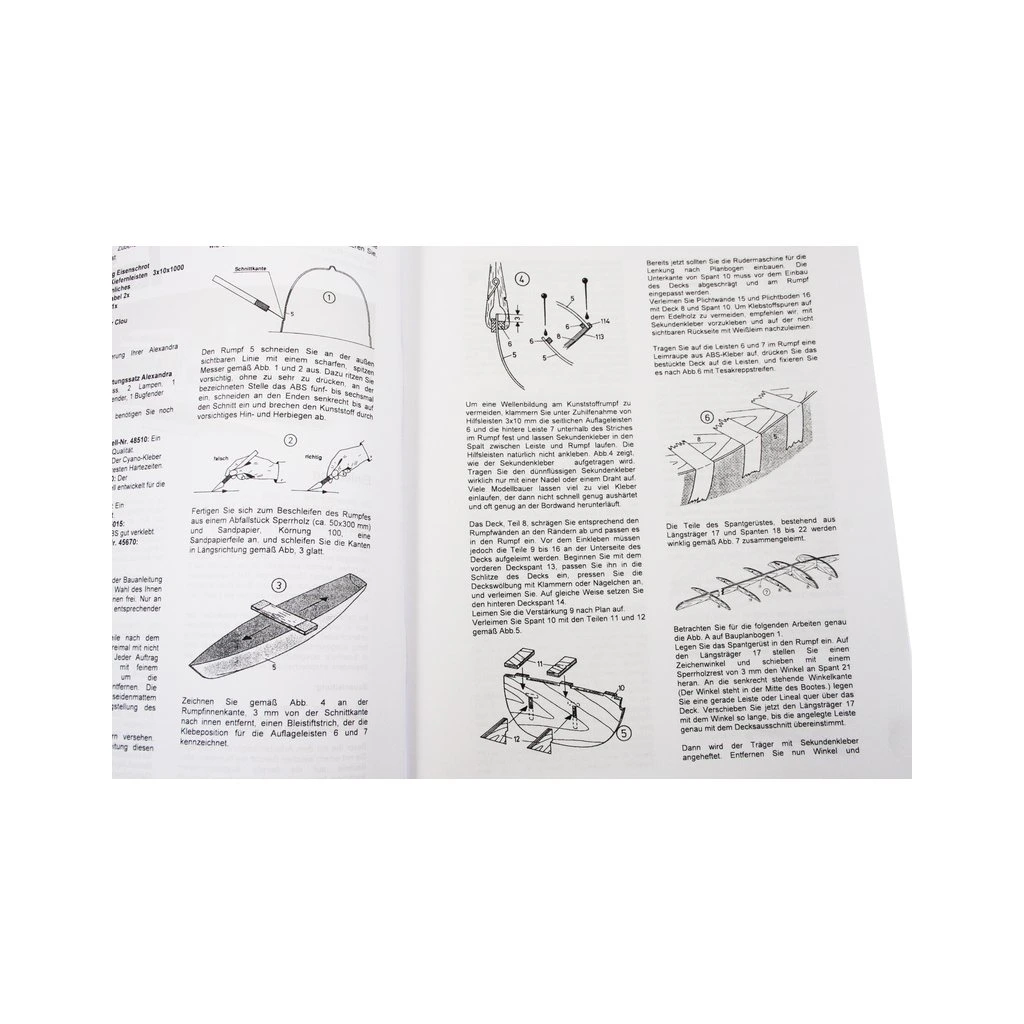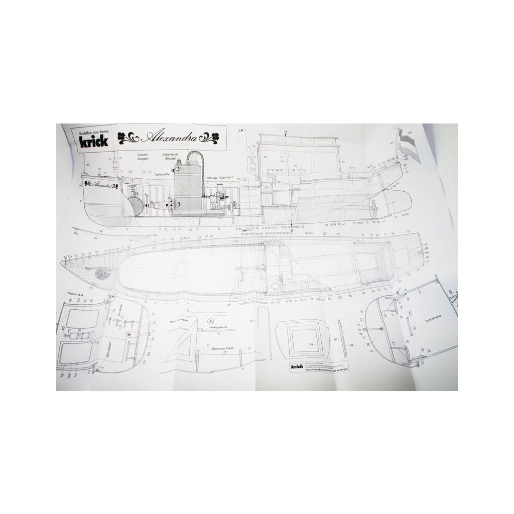 Stavebnice modelu lodi Krick Alexandra obsahuje plastový ABS výlisek trupu, dřevěné díly paluby, montážní součásti, německý manuál a pokyny k provozu.