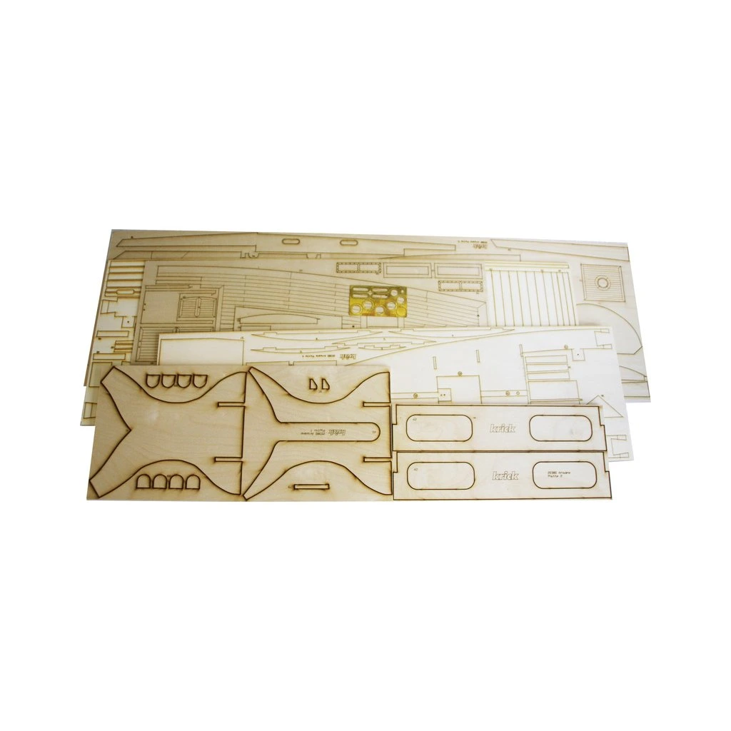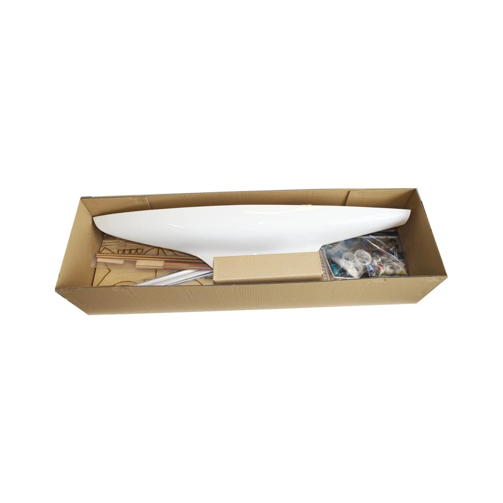 Balení obsahuje laminátový bíle nabarvený trup, hliníkový stěžeň, plachty, sadu překližkových dílů, sadu dřevěných lišt, sáčky s drobnými díly, díly z mosazi, sadu výkresů a vícejazyčný manuál.