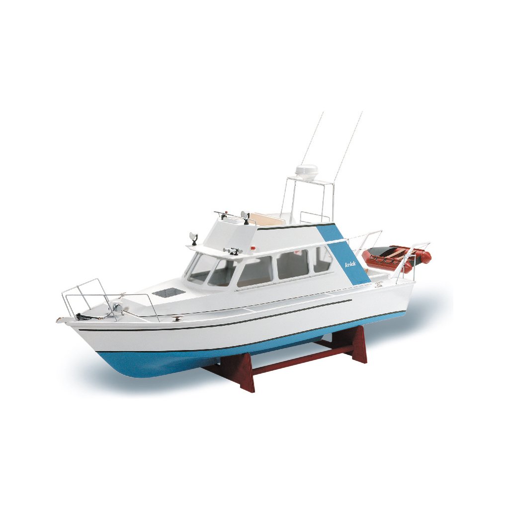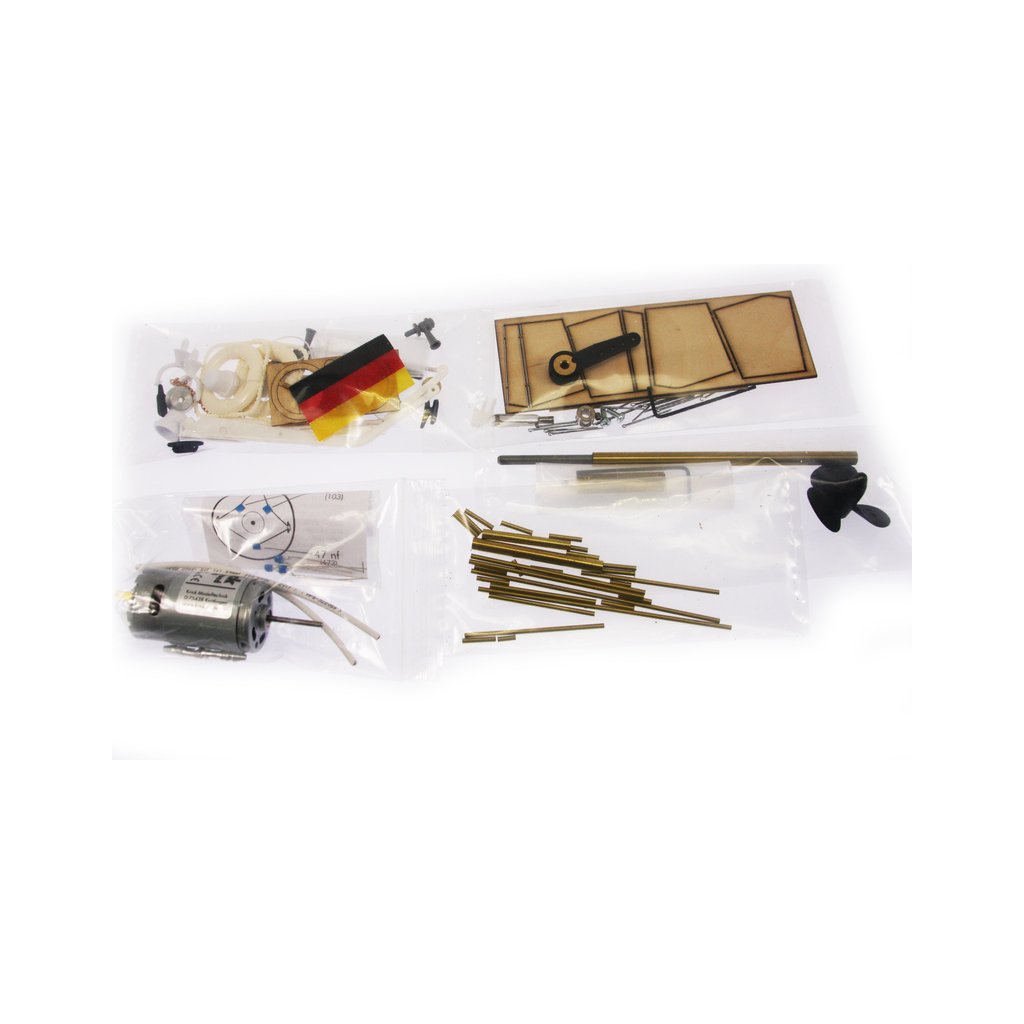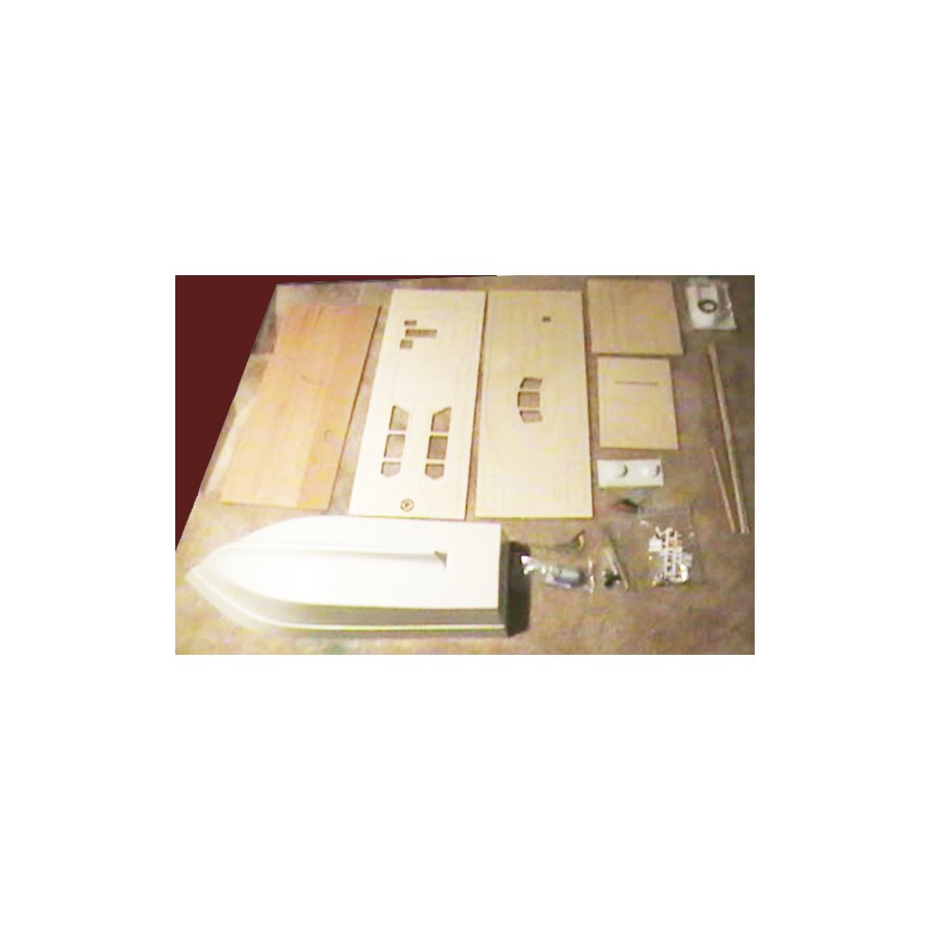 Výlisek trupu z ABS, sada laserem řezaných překližkových dílů, motor Speed 400, lodní šroub s hřídelí, táhla, páka řízení, plastové maketové doplňky, čirý plast na zasklení kabiny, montážní příslušenství, návod v češtině, manuál EN.