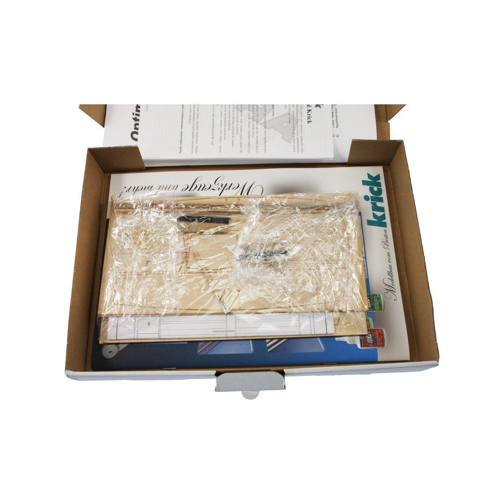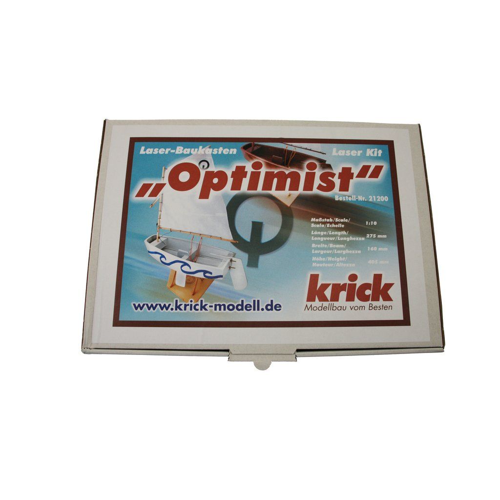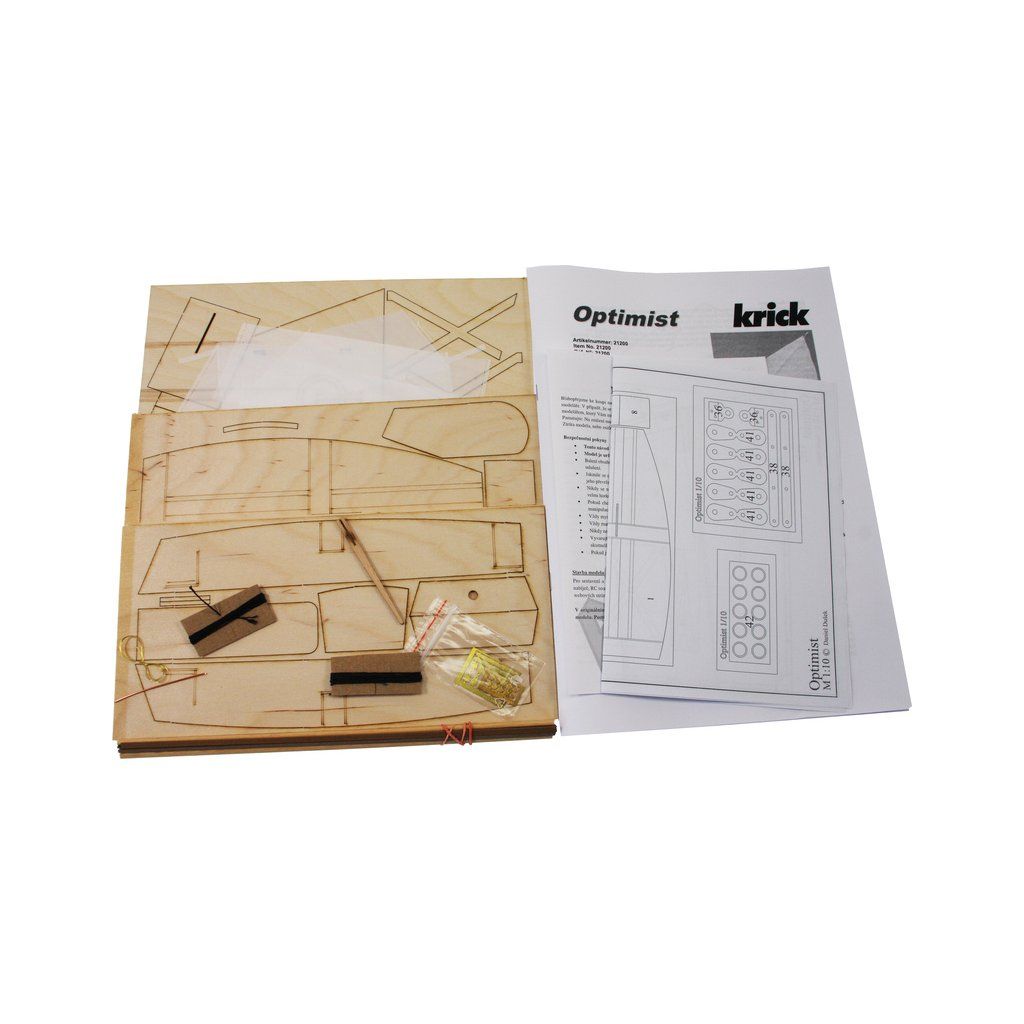 Model plachetnice Krick Optimist 1:10 je celodřevěná stavebnice malé lodičky pro začínající lodní modeláře. V balení jsou laserem vyřezané překližkové součásti, drobné příslušenství, plachta a plán 1:1 s návodem.