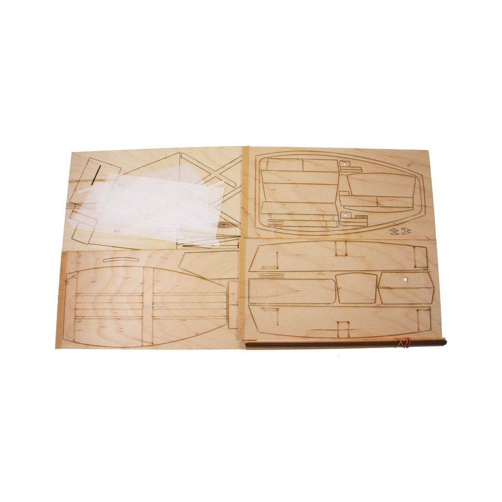 Po otevření víka krabice naleznete dřevěné díly modelu z překližky, sadu lišt, drobné součásti uzavřené v sáčcích, sadu výkresů a manuál.
