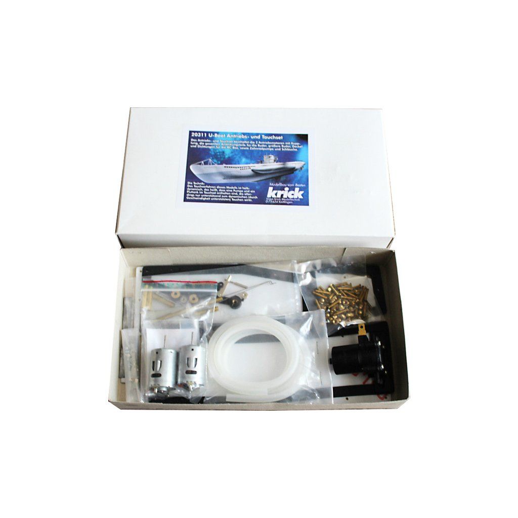 Sada pro pohon a ponor ponorky Krick U-Boot Typ VI, obsahuje dva motory Speed 400 pro pohon, vodní čerpadlo, hadičku, 3ks kryt s těsněním, sadu pák řízení s příslušenstvím, sadu kardanů a spojovací materiál.