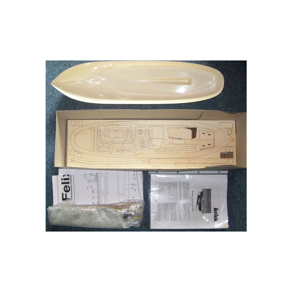 Stavebnice RC modelu lodi od firmy Krick, Přístavní člun Felix. Model je určen pro začátečínající lodní modeláře. Obsahuje plastový trup, dřevěné díly paluby a interiéru, motor Speed 400, lodní šroub s hřídelí, kormidlo, volant, vlajku, maketové díly a drobné příslušenství.