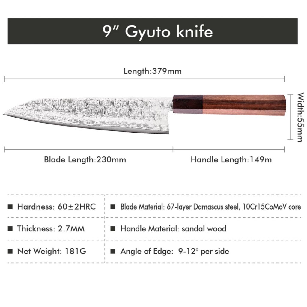 Nůž gyuto/Chef je ideální pro všestranné využití. Díky tomu, že se hřbet nože a ostří zužují do špičky, má ideální tvar pro každý druh krájení. Je vhodný pro porcování masa, krájení ryb, plátkování, čištění masa a ryb, ovoce a zeleniny. Výše položený hrot Vám umožní i kolébkové krájení bylinek nebo ořechů. Název „Gyuto“ znamená doslova „kráječ masa“, což naznačuje jeho původní účel, ale tento nůž je dnes ceněn pro svou schopnost zvládnout širokou škálu kuchyňských úkolů.