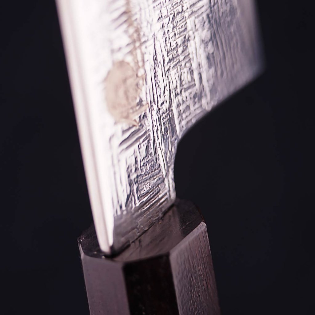 Jádro čepele je vyrobeno z damascénské oceli s tvrdostí 61±1 HRC, obklopené 66 vrstvami dvou druhů nerezové oceli. Toto vrstvení zajišťuje maximální houževnatost a odolnost. Surový vzor ručně kovaného damašku. Neuhlazený, živý povrch s výraznou kresbou vrstev oceli odhaluje skutečný charakter řemeslné výroby a dává každému noži jedinečnou identitu. Precizní zpracování zaručuje snadnou údržbu a dlouhotrvající ostrost, kterou lze snadno obnovit broušením na vodních kamenech.