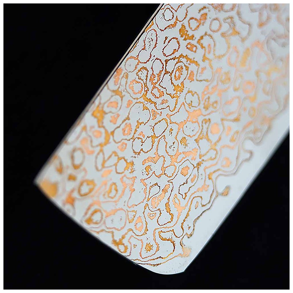 Základem čepele je funkční jádro z vysoce kvalitní nerezové oceli 10Cr15CoMoV s vysokým obsahem uhlíku, které zajišťuje vysokou tvrdost, stabilitu ostří a dlouhodobou řezivost. Jádro je tepelně zpracováno na tvrdost přibližně 60 ±2 HRC, což umožňuje velmi ostré broušení v úhlu 9–12° na stranu při zachování mechanické odolnosti při každodenním použití. Na toto jádro jsou následně řízeně nanášeny vrstvy nerezové oceli a mědi (cuprum), čímž vzniká charakteristická damašková struktura. Na rozdíl od klasického damašku zde vzor nevzniká skládáním a překládáním ocelí, ale precizním vrstvením kovů s rozdílnými fyzikálními a chemickými vlastnostmi. Měď se nepodílí na samotné funkci ostří – její úloha je primárně vizuální a strukturální v povrchových vrstvách, kde vytváří typické zlatavé linie a neopakovatelnou kresbu. Pro zvýraznění struktury damašku nejsou tyto čepele upravovány chemickým leptáním, ale mechanickou metodou pískování. Jemný proud abrazivních částic selektivně odstraňuje měkčí vrstvy materiálu a přirozeně odhaluje vnitřní strukturu oceli. Výsledkem je jemně matný, hedvábně lesklý povrch, který je nejen vizuálně atraktivní, ale také vykazuje vyšší odolnost vůči korozi, opotřebení a mechanickému poškození, a to bez použití chemikálií. Sendvičová konstrukce zároveň přispívá k lepšímu rozložení pnutí v materiálu. Kombinace tvrdého jádra a houževnatějších vnějších vrstev snižuje riziko vzniku mikroskopických trhlin a zvyšuje stabilitu čepele při dynamickém zatížení během krájení.
