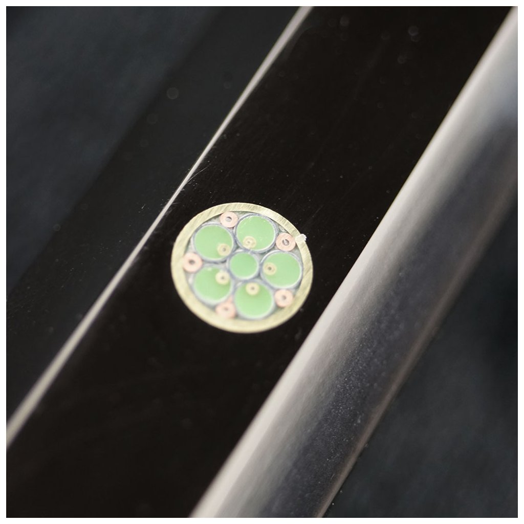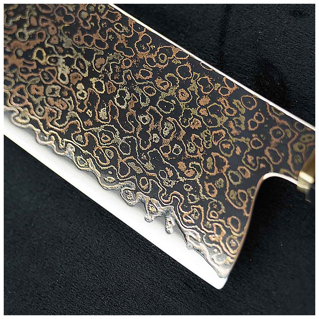 Základem čepele je funkční jádro z vysoce kvalitní nerezové oceli 10Cr15CoMoV s vysokým obsahem uhlíku, které zajišťuje vysokou tvrdost, stabilitu ostří a dlouhodobou řezivost. Jádro je tepelně zpracováno na tvrdost přibližně 60 ±2 HRC, což umožňuje velmi ostré broušení v úhlu 9–12° na stranu při zachování mechanické odolnosti při každodenním použití. Na toto jádro jsou následně řízeně nanášeny vrstvy nerezové oceli a mědi (cuprum), čímž vzniká charakteristická damašková struktura. Na rozdíl od klasického damašku zde vzor nevzniká skládáním a překládáním ocelí, ale precizním vrstvením kovů s rozdílnými fyzikálními a chemickými vlastnostmi. Měď se nepodílí na samotné funkci ostří – její úloha je primárně vizuální a strukturální v povrchových vrstvách, kde vytváří typické zlatavé linie a neopakovatelnou kresbu. Pro zvýraznění struktury damašku nejsou tyto čepele upravovány chemickým leptáním, ale mechanickou metodou pískování. Jemný proud abrazivních částic selektivně odstraňuje měkčí vrstvy materiálu a přirozeně odhaluje vnitřní strukturu oceli. Výsledkem je jemně matný, hedvábně lesklý povrch, který je nejen vizuálně atraktivní, ale také vykazuje vyšší odolnost vůči korozi, opotřebení a mechanickému poškození, a to bez použití chemikálií. Sendvičová konstrukce zároveň přispívá k lepšímu rozložení pnutí v materiálu. Kombinace tvrdého jádra a houževnatějších vnějších vrstev snižuje riziko vzniku mikroskopických trhlin a zvyšuje stabilitu čepele při dynamickém zatížení během krájení.