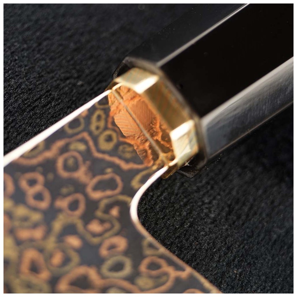 Rukojeť v tradičním osmihranném provedení poskytuje bezpečný a pohodlný úchop i v náročných podmínkách. Je vyrobena z černé pryskyřice a doplněna ozdobným středovým nýtem a bolstrem z damaškové oceli s příměsí mědi, který zajišťuje plynulý přechod mezi čepelí a rukojetí a podtrhuje celkový charakter nože.