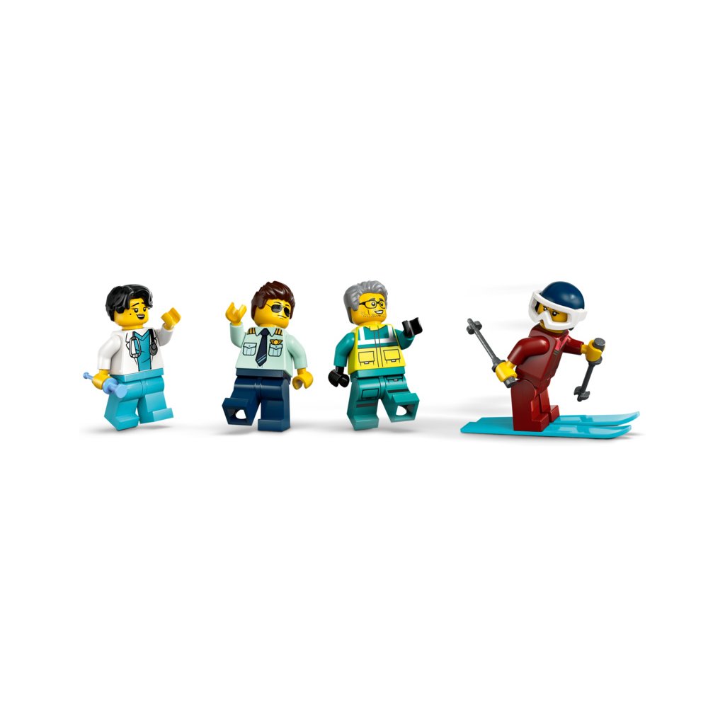 - Co najdete v krabici? – Vše, co potřebujete k sestavení letadla záchranářské služby, sněžného skútru a malé letištní scény s větrným rukávem a navíc minifigurku pilota, lékaře, záchranáře a lyžaře