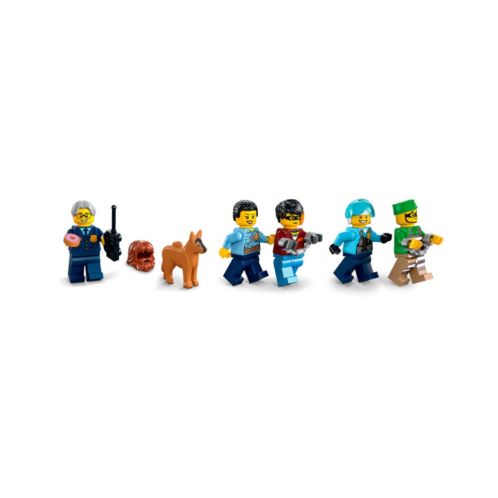 - Samozřejmostí jsou doplňky pro minifigurku LEGO® – Tato policejní sada nabízí celou řadu zábavných doplňků pro kreativní hraní, včetně dílků v podobě vysílačky, kamery, psí hromádky a koblihy