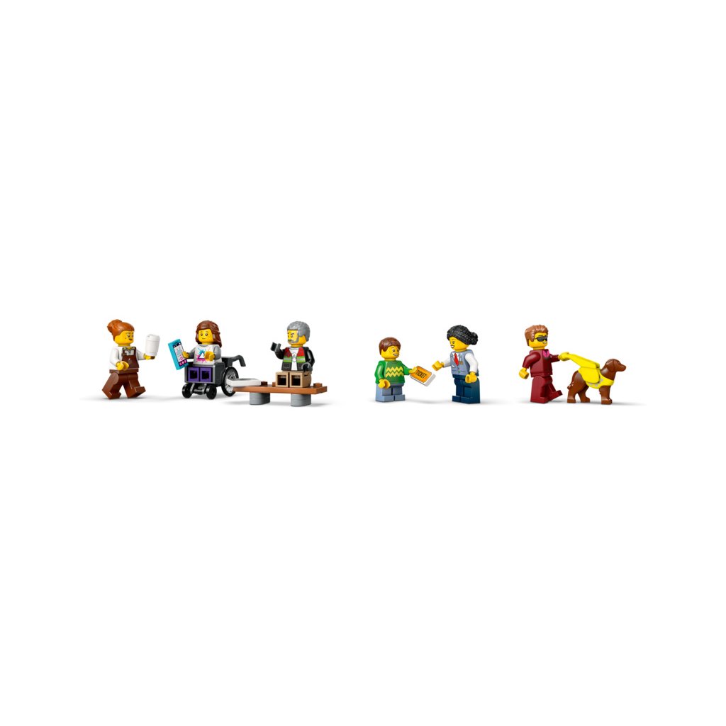 - Co najdete v krabici? – Tato stavebnice od LEGO® City obsahuje vše, co děti potřebují k sestavení tramvaje a zastávky s nástupištěm pro cestující a kavárnou, a navíc 6 minifigurek a figurku vodicího psa