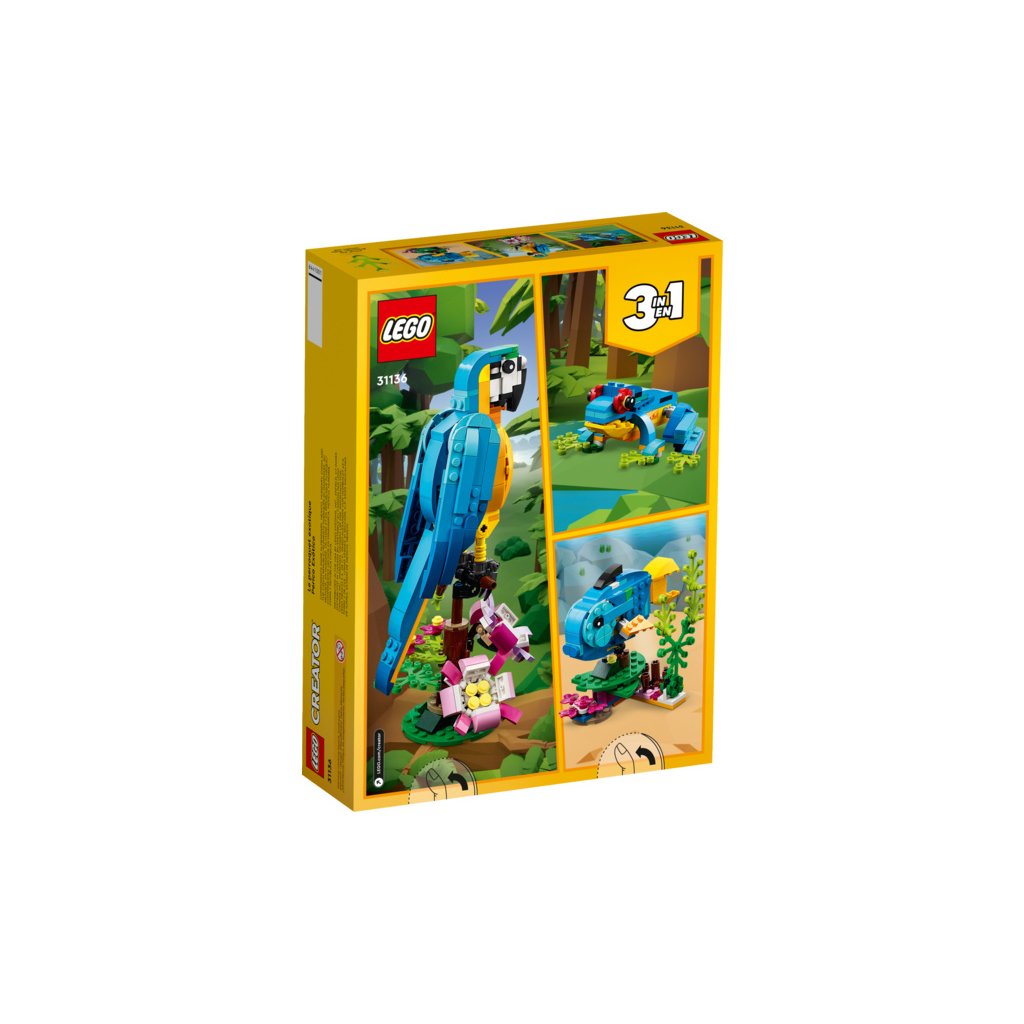Se stavebnicí Exotický papoušek (31136) od LEGO® Creator 3 v 1 se malí stavitelé a milovníci zvířat od 7 let vypraví do pralesa, kde zažijí akční dobrodružství. Mohou se těšit na pestrobarevného papouška, který sedí na větvi, kde se otáčí a hýbe křídly a ocasem.