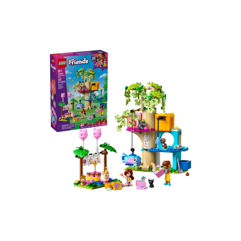 Objevte parádní stavebnici pro holky, kluky a milovníky koček od 6 let. Stavebnice LEGO® Friends (42666) Kočičí narozeninová oslava a dům na stromě obsahuje 2 minipanenky, 5 figurek koček a spoustu doplňků pro nápadité hraní plné zábavných okamžiků s kočkami.