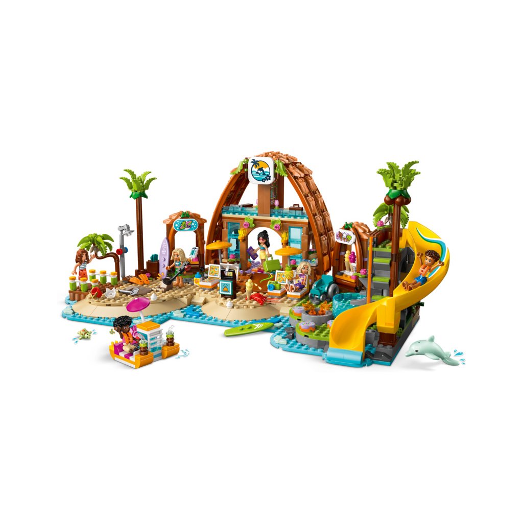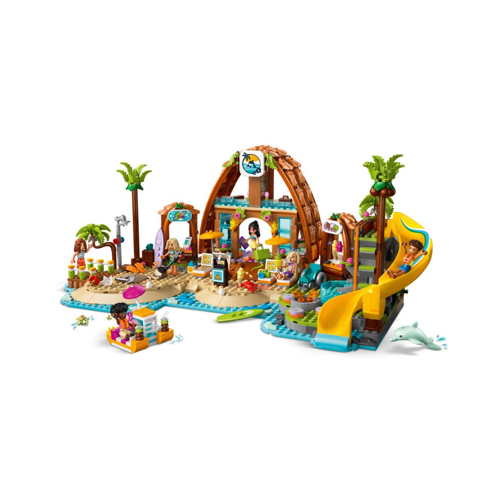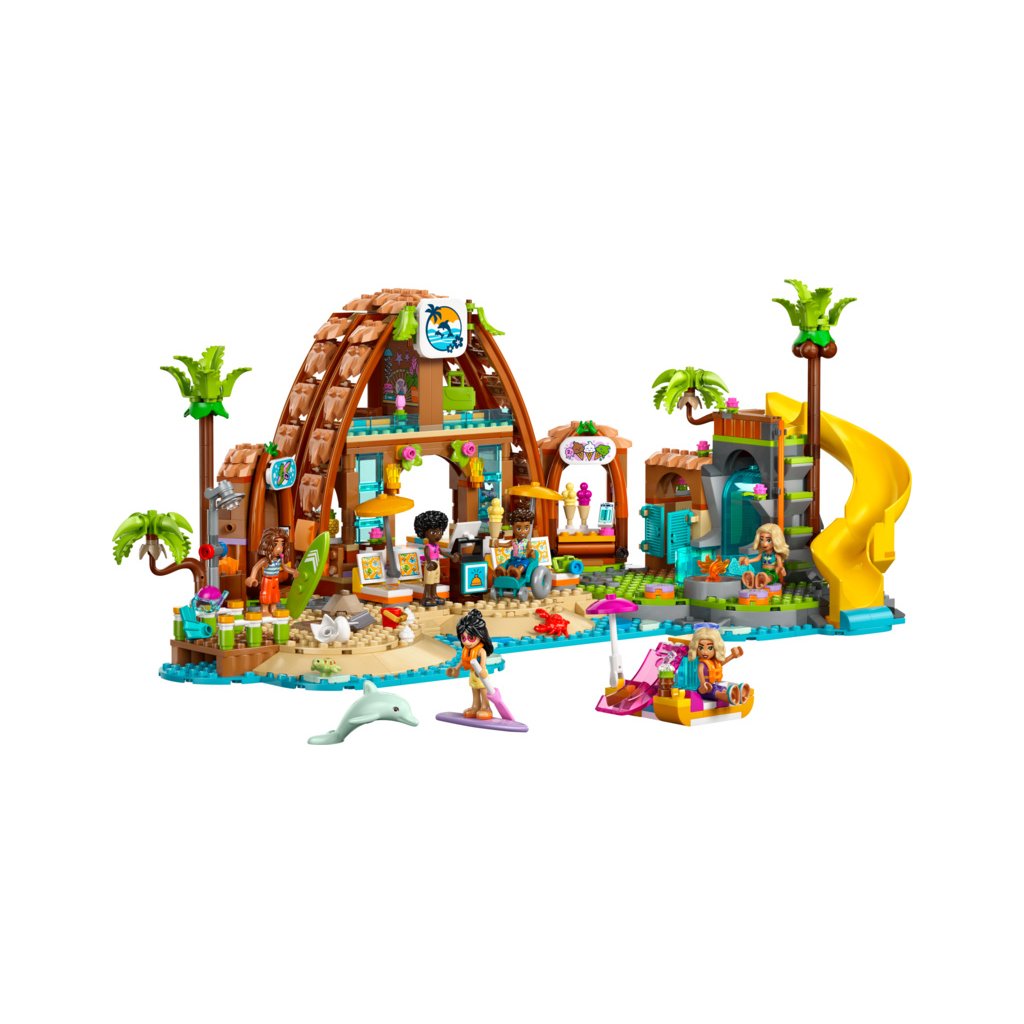 - Kreativní hračka s doplňky pro plážové letovisko – Tato stavebnice LEGO® obsahuje spoustu doplňků, včetně nápojů, zmrzlinových kornoutů, surfovacích prken, helem, lopaty, fotoaparátu, kufru a plážového invalidního vozíku