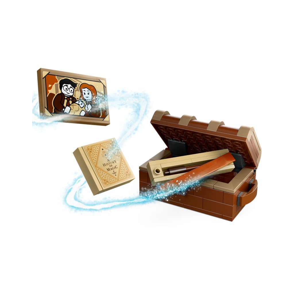 - Hravé doplňky – Součástí stavebnice je také sestavitelný kufr, ve kterém najdete portrét Harryho Pottera s rodiči, knihu A History of Magic (Historie magie) a hůlku