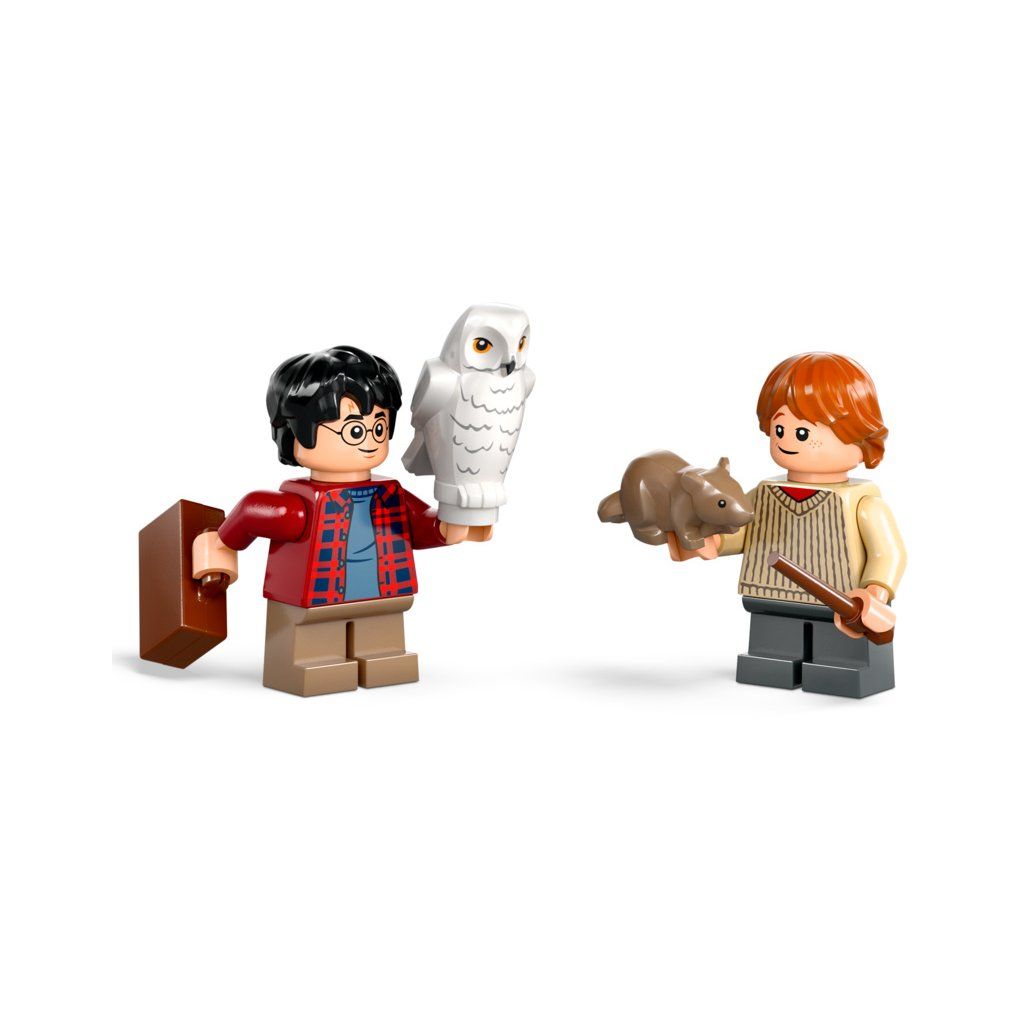 - Dobrodružná stavebnice se 4 postavami ze světa Harryho Pottera– Minifigurka Harryho Pottera a Rona Weasleyho, figurka Hedviky a Prašivky, zavazadlo a 2 hůlky