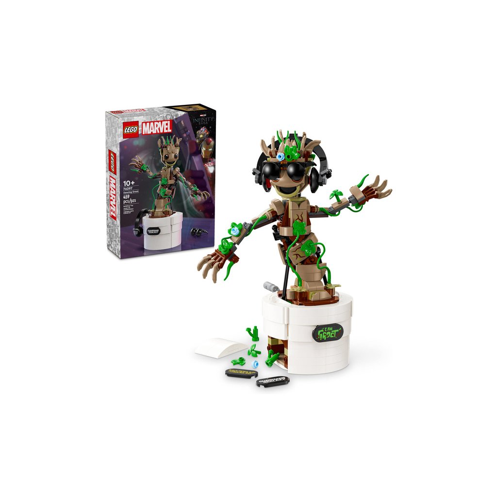 - Tančící superhrdina – Stavebnice obsahuje sestavitelného Groota v květináči, 3 různé popisky, které lze připevnit na květináč, a doplňky, včetně sluchátek, slunečních brýlí a doplňkových listů