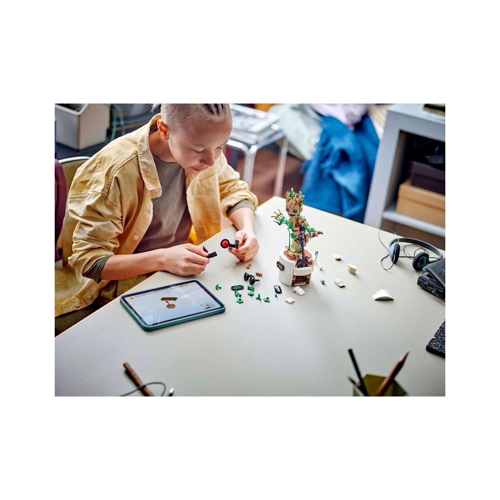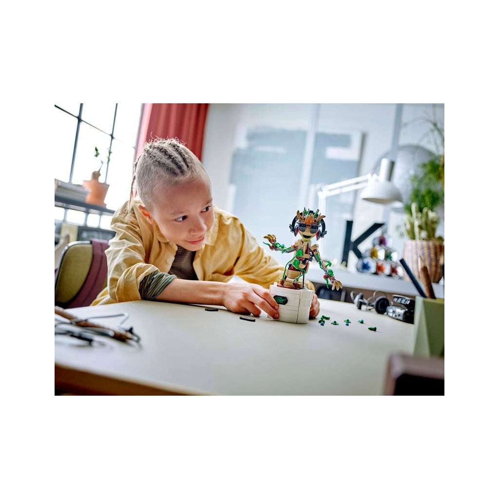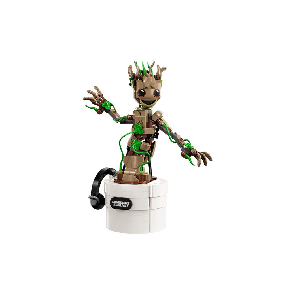 Model Groota pro děti má pohyblivou hlavu a pohyblivé paže. Když děti otočí držadlem na zadní straně květináče, kloubový Groot začne tančit. Figurku lze přizpůsobit pomocí doplňkových listů, sestavitelných sluchátek a slunečních brýlí a děti si mohou přizpůsobit Grootův květináč přidáním 1 ze 3 různých popisků na přední stranu (včetně jedné související s televizním seriálem Já jsem Groot). Veškeré toto příslušenství lze uložit do vestavěné přihrádky květináče. Aby bylo stavění modelu ještě zábavnější, aplikace LEGO Builder dětem umožňuje přibližovat a otáčet modely ve 3D a průběžně sledovat postup stavění.
