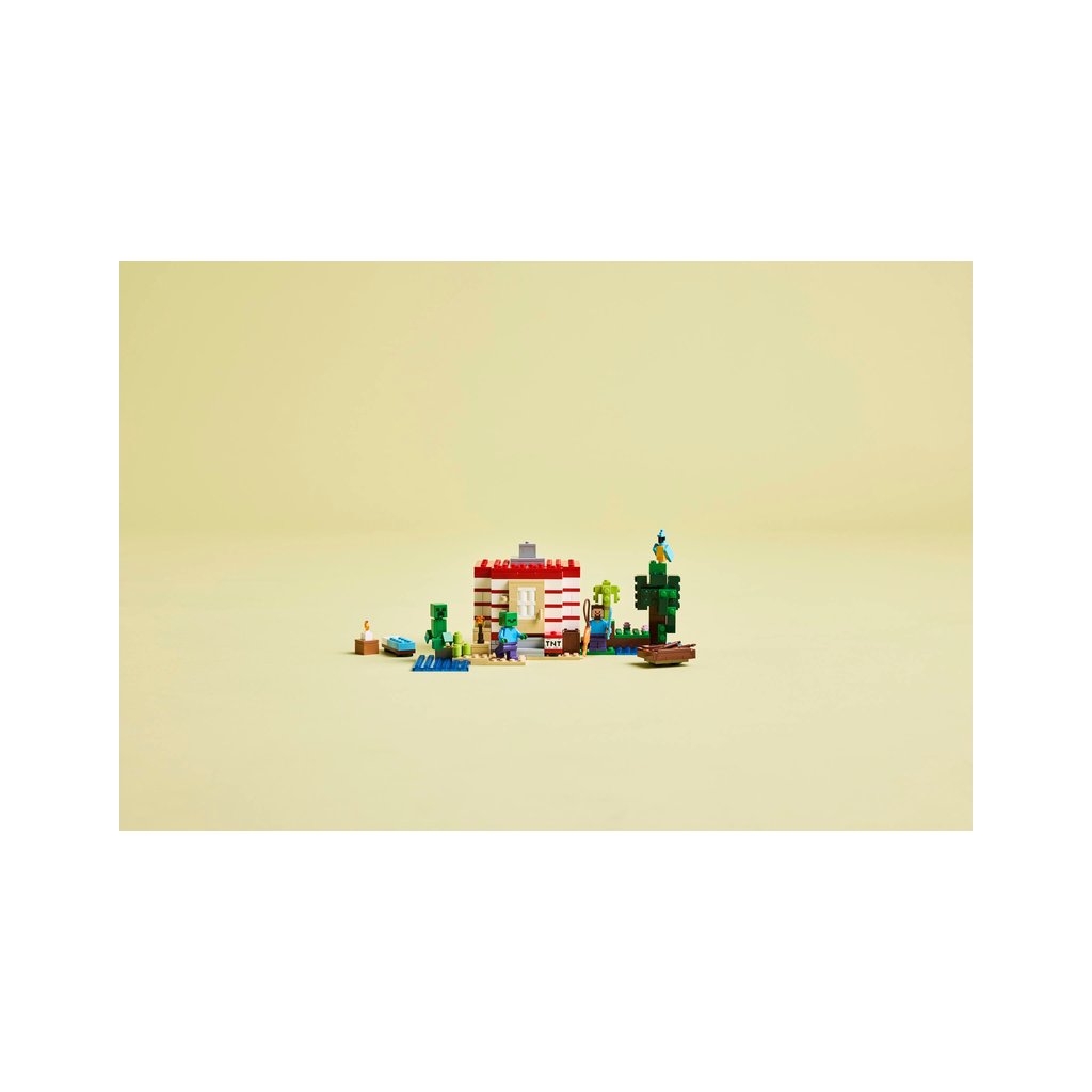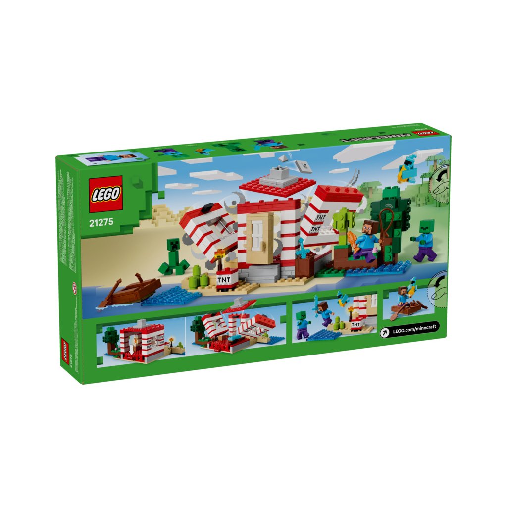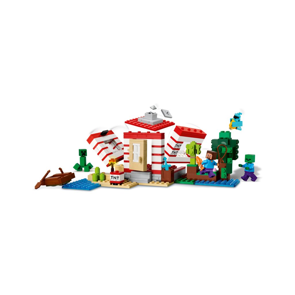Sestavitelný dům se nachází v biomu džungle v Minecraftu a vypadá jako velká verze ikonického TNT ve hře. Spínač na boku umožňuje dětem aktivovat funkci výbuchu TNT, která vyhodí do povětří celý dům. Až se usadí prach, děti můžou dům znovu postavit, aby se připravily na další dobrodružství. Minifigurky Stevea, Creepera a zombie inspirují ke kreativnímu hraní a akčním bitvám. Mezi autentickými doplňky LEGO Minecraft najdete loď, rybářský prut, rybu, papouška a listí z džungle. Aplikace LEGO® Builder dětem přináší ještě větší porci zábavy díky funkci přibližování a otáčení modelů ve 3D. Stavebnice obsahuje 287 dílků.