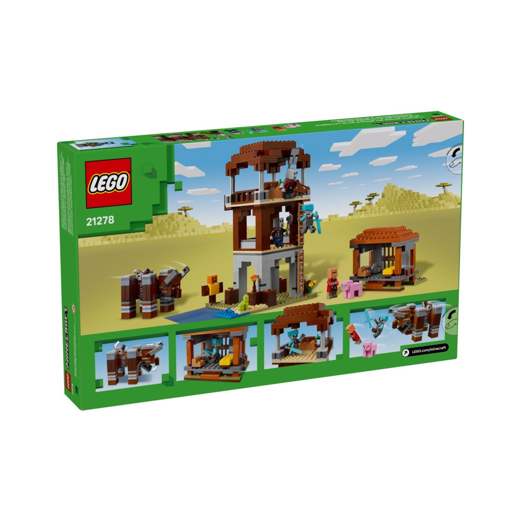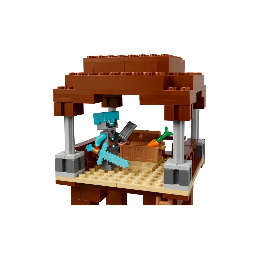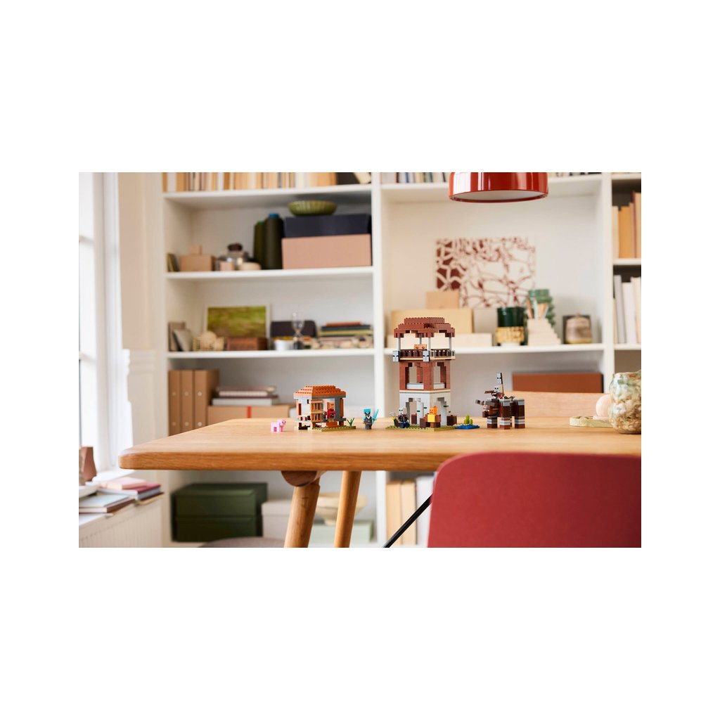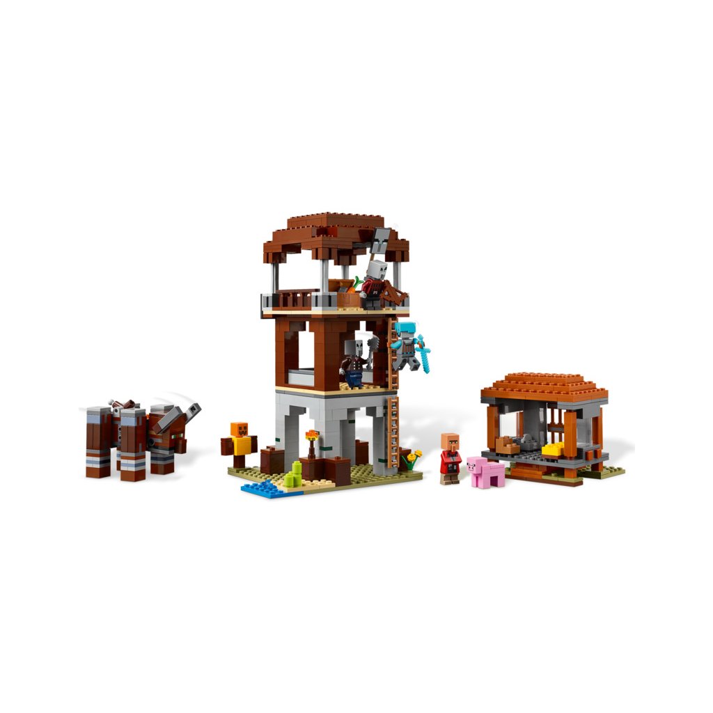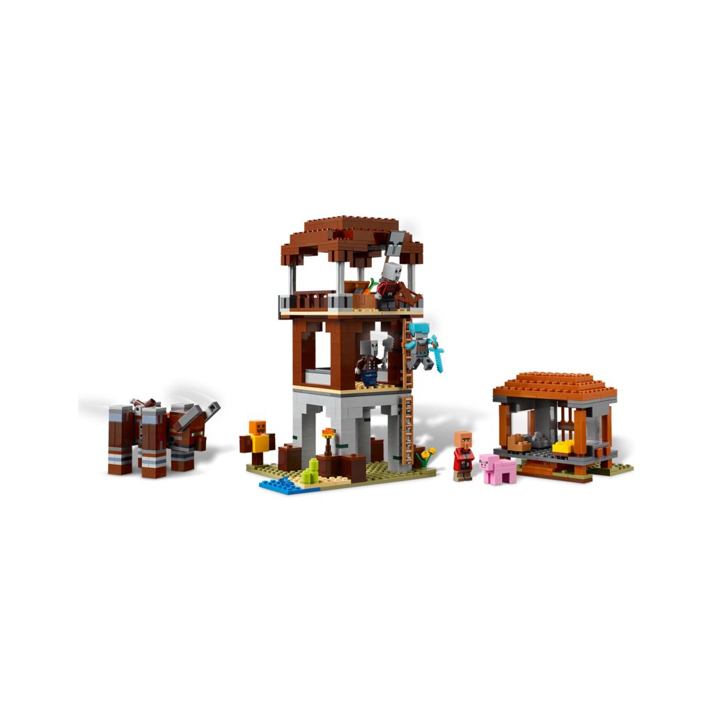 Stavebnice obsahuje 4 minifigurky LEGO Minecraft: vesmírného strážce, kapitána nájezdu, vesničana zedníka a mstitele. Sestavitelná figurka Ničitele má funkci ovládanou pákou, která dětem umožňuje provádět pohyby, při kterých figurka práská čelistí a naráží hlavou. Strážní věž obsahuje žebříky, které umožňují přístup do tří pater, prapory s tvářemi plenitelů a truhlu s drahocennou kořistí. Dům zedníka má otevírací dveře a zařízený interiér s postelí a řezačkou kamení. Součástí je také figurka prasete LEGO Minecraft a doplňky včetně cvičné figuríny, pochodně, mrkve, železného ingotu, diamantové helmy, diamantového meče, kuše a železné sekery. S aplikací LEGO Builder si děti užijí ještě větší porci zábavy a umožní jim na zařízení přibližovat a otáčet modely ve 3D. Součástí je 665 dílků.