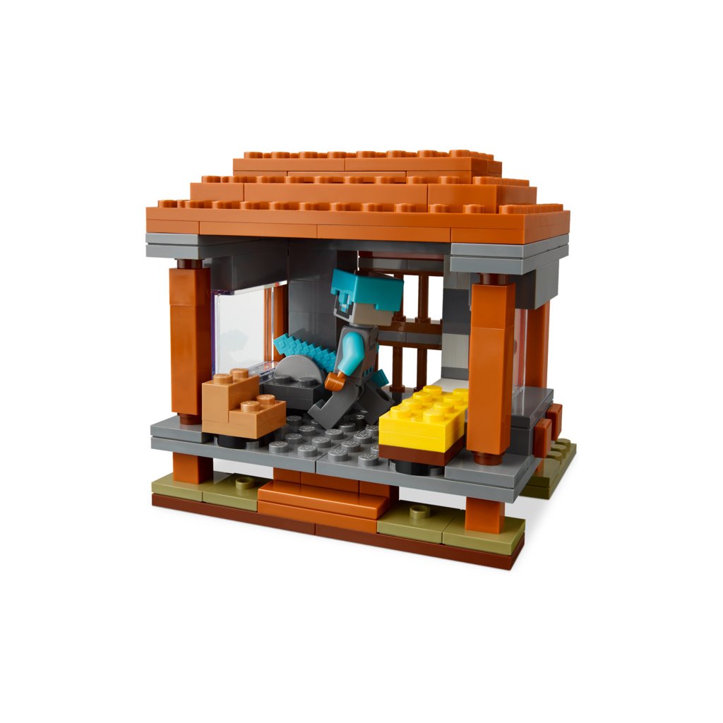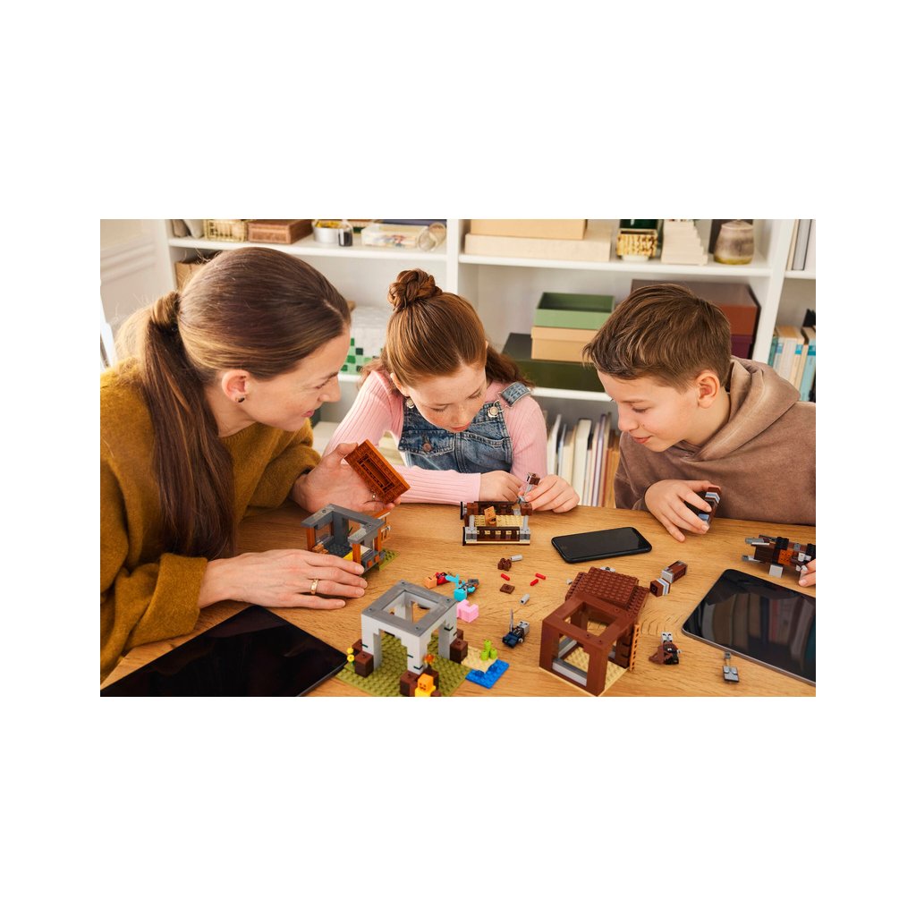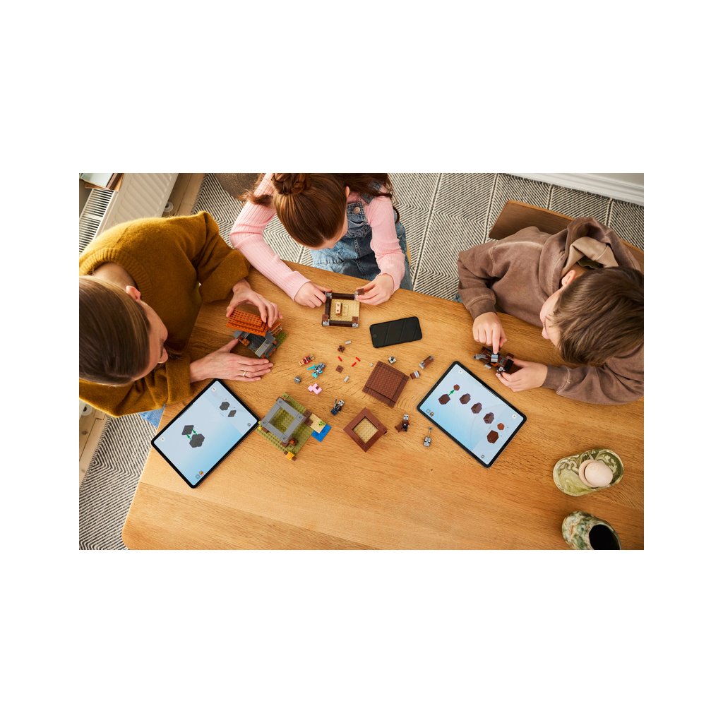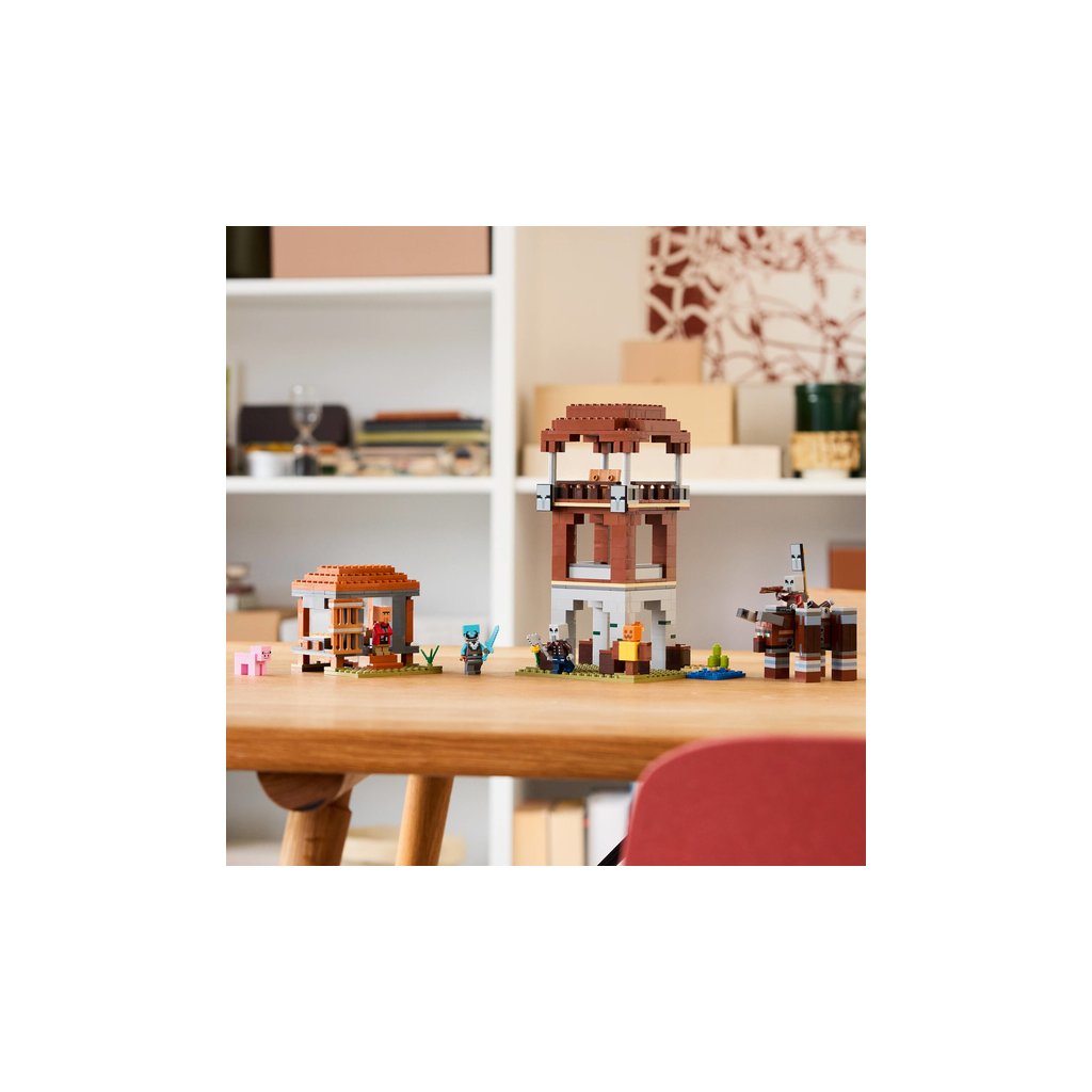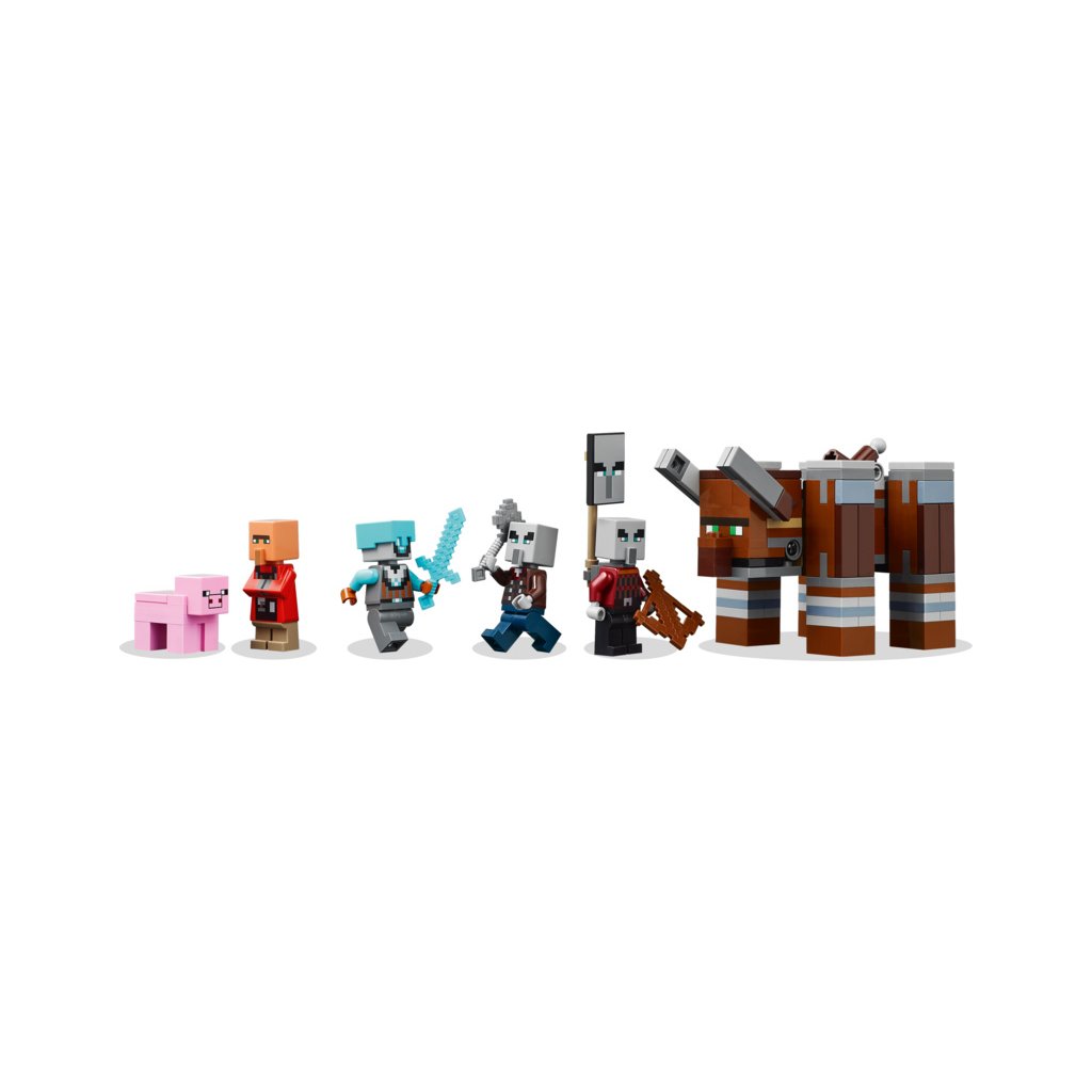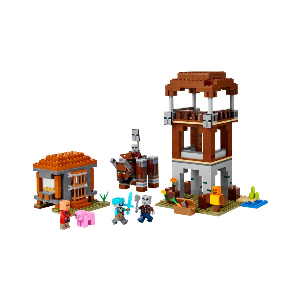 Stavebnice obsahuje 4 minifigurky LEGO Minecraft: vesmírného strážce, kapitána nájezdu, vesničana zedníka a mstitele. Sestavitelná figurka Ničitele má funkci ovládanou pákou, která dětem umožňuje provádět pohyby, při kterých figurka práská čelistí a naráží hlavou. Strážní věž obsahuje žebříky, které umožňují přístup do tří pater, prapory s tvářemi plenitelů a truhlu s drahocennou kořistí. Dům zedníka má otevírací dveře a zařízený interiér s postelí a řezačkou kamení. Součástí je také figurka prasete LEGO Minecraft a doplňky včetně cvičné figuríny, pochodně, mrkve, železného ingotu, diamantové helmy, diamantového meče, kuše a železné sekery. S aplikací LEGO Builder si děti užijí ještě větší porci zábavy a umožní jim na zařízení přibližovat a otáčet modely ve 3D. Součástí je 665 dílků.
