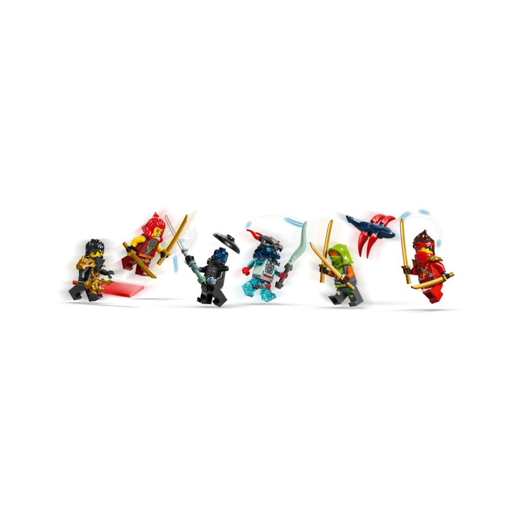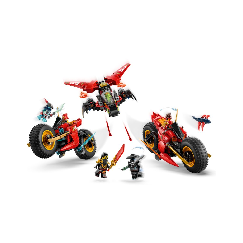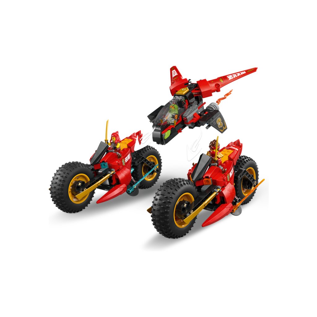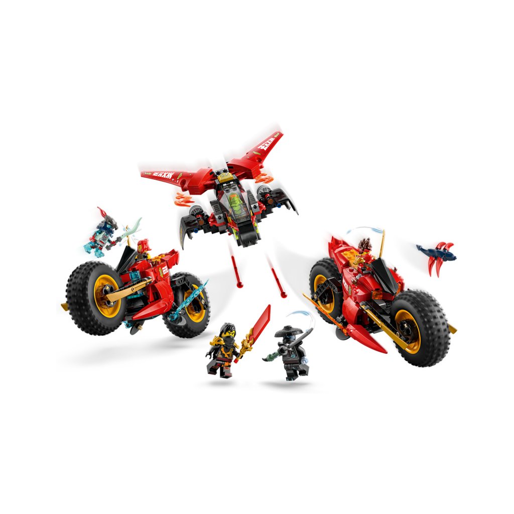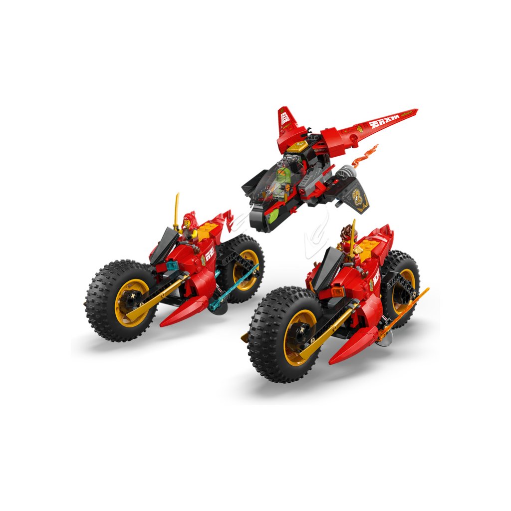 - Odnímatelná nindžovská vozidla – Velké vozidlo NINJAGO® lze rozdělit na 3 menší vozidla: Kaiovu nindžovskou motorku, Wyldfyreinu nindžovskou motorku a Frakovu stíhačku se 2 vystřelovači