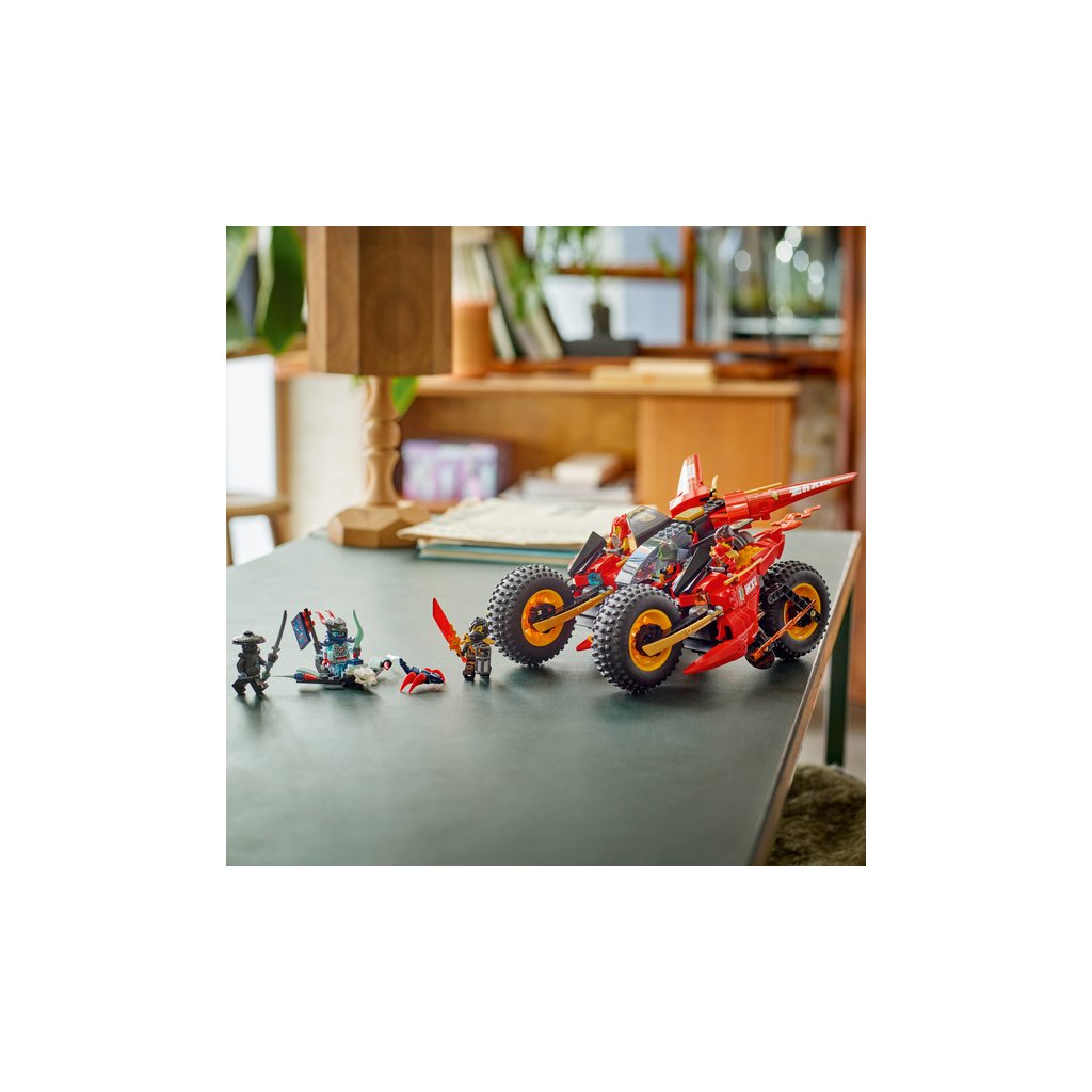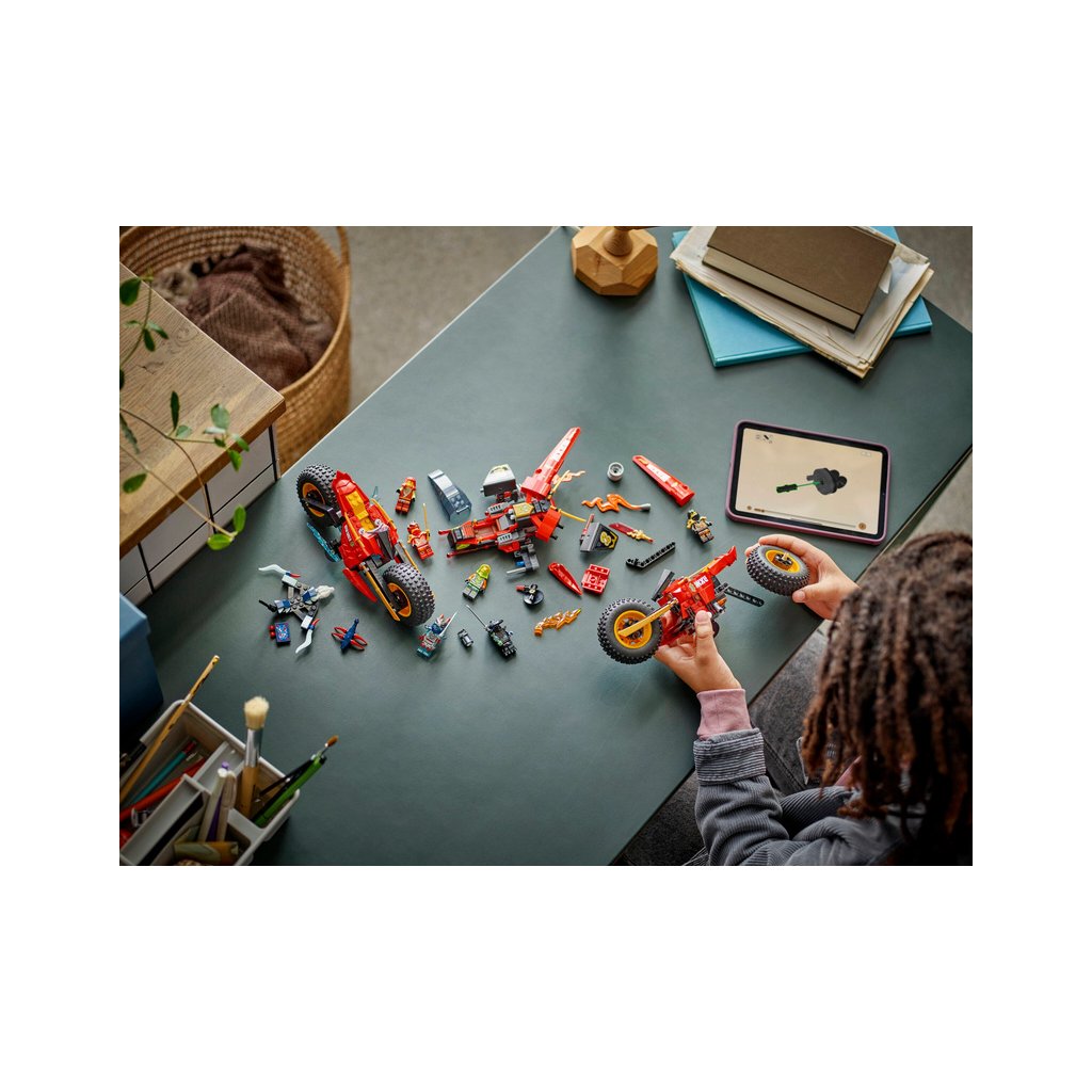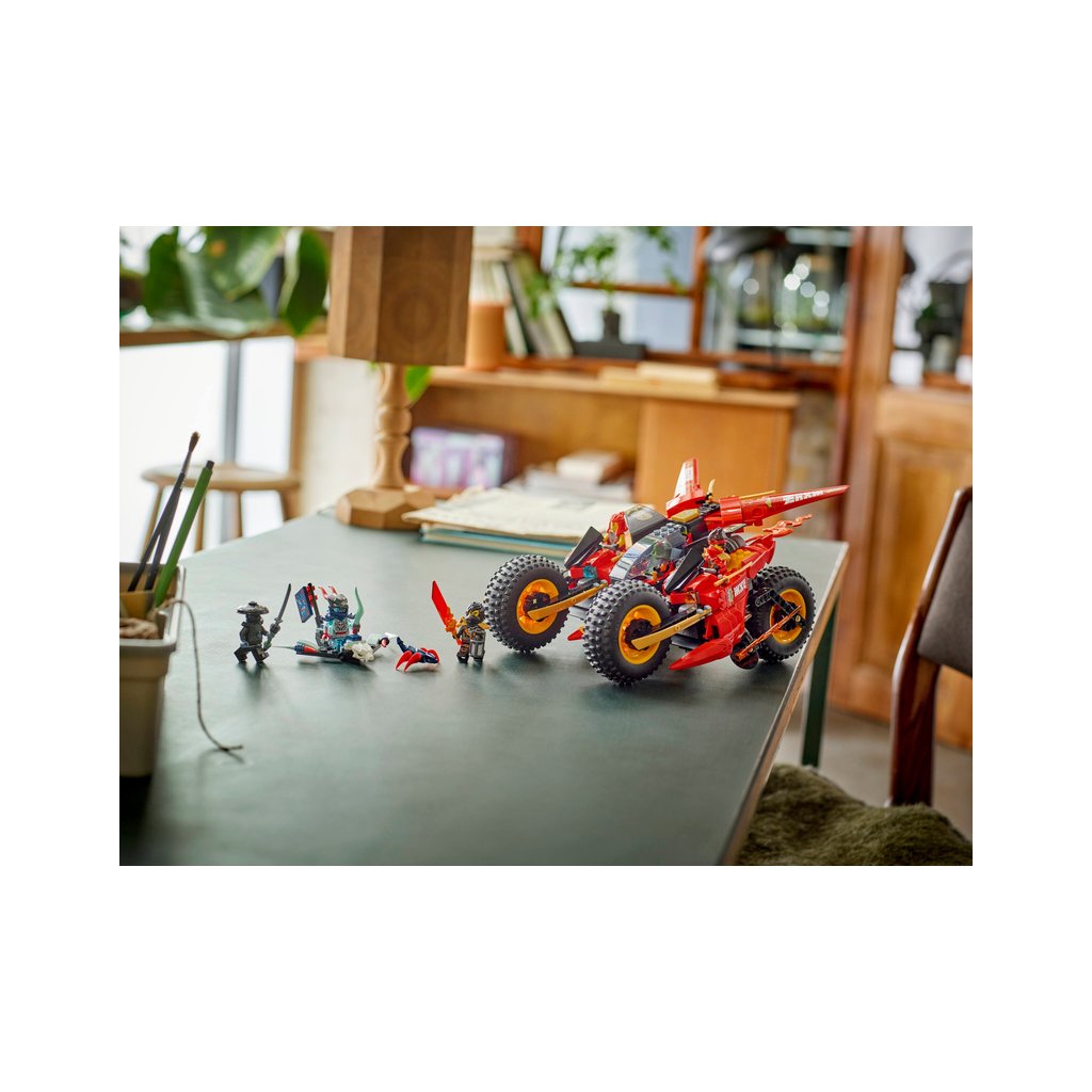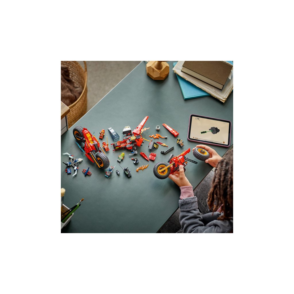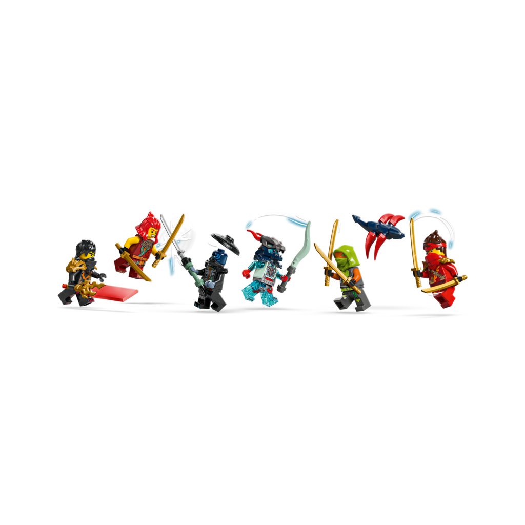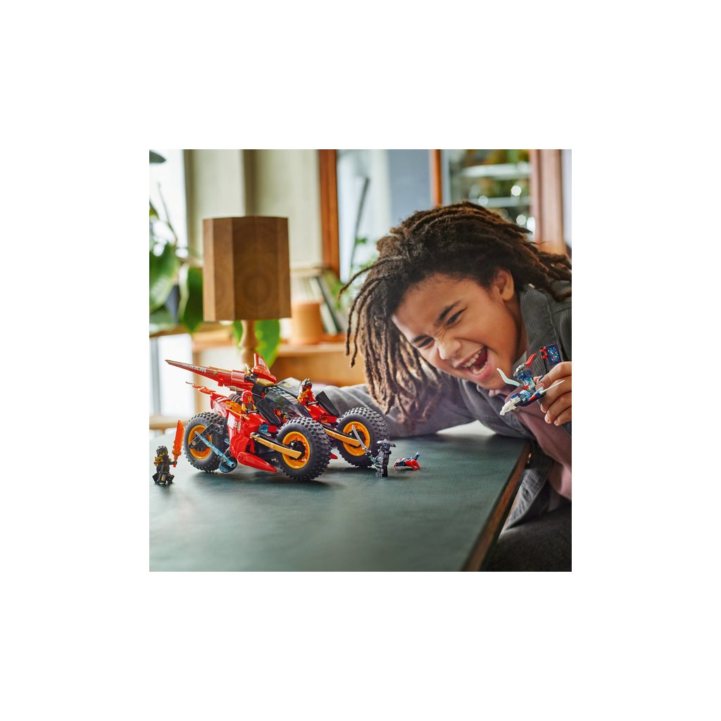 - Odnímatelná nindžovská vozidla – Velké vozidlo NINJAGO® lze rozdělit na 3 menší vozidla: Kaiovu nindžovskou motorku, Wyldfyreinu nindžovskou motorku a Frakovu stíhačku se 2 vystřelovači