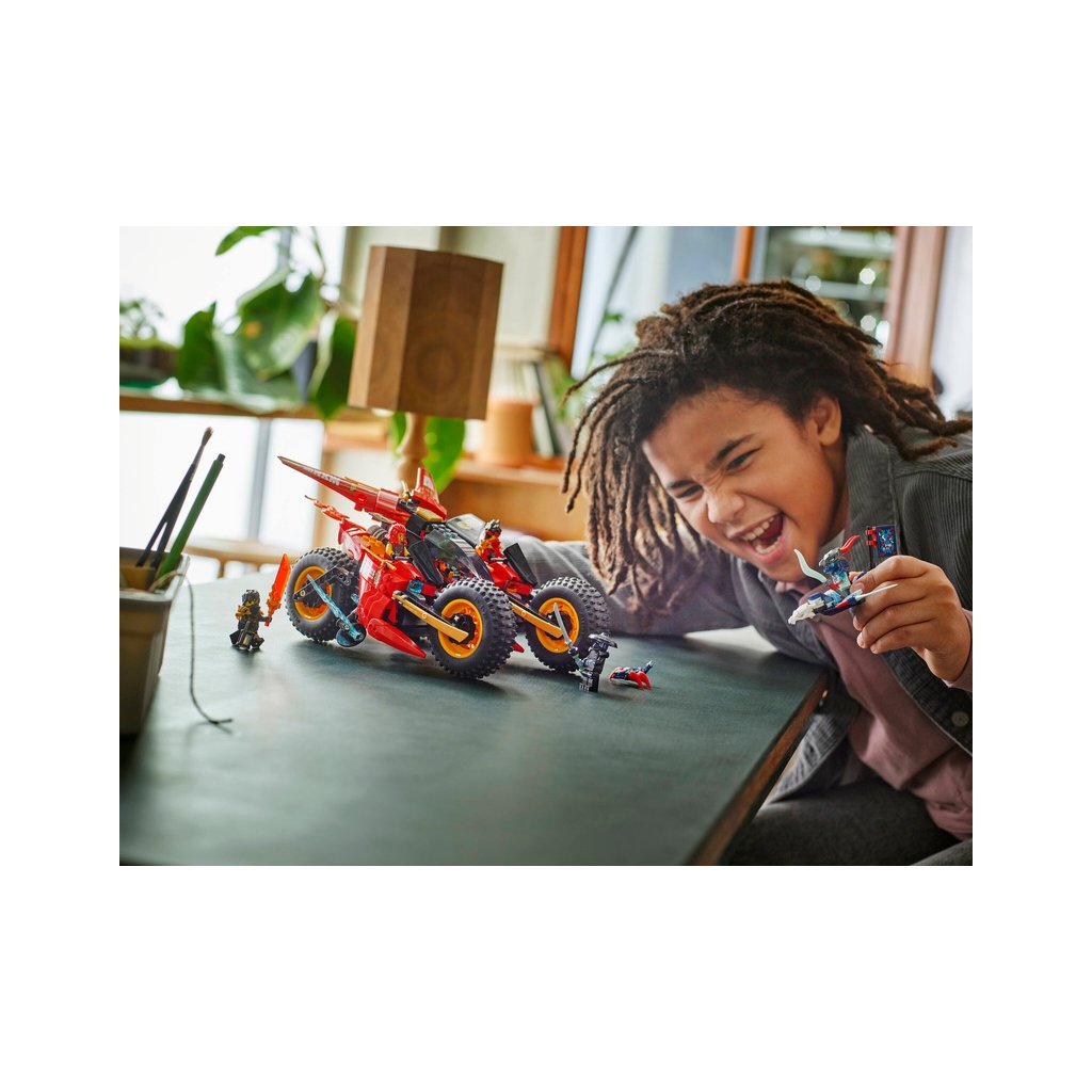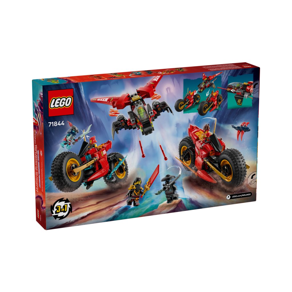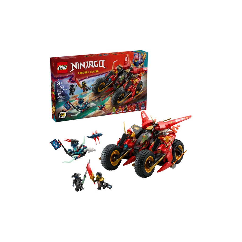 Děti od 8 let si se stavebnicí Bojového vozidla 3 v 1 (71844) připomenou scény z 3. řady televizního seriálu NINJAGO® Dračí povstání. Děti si můžou hrát s velkou akční figurkou nindžovské motorky a pak ji rozdělit na 3 menší vozidla: Kaiovu motorku, Wyldfyreinu motorku a Frakovu stíhačku se 2 vystřelovači.