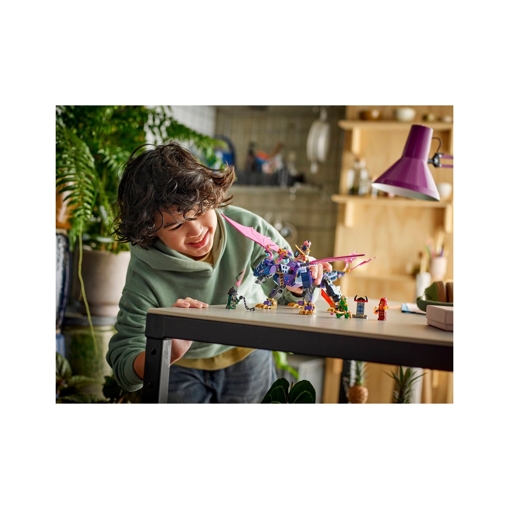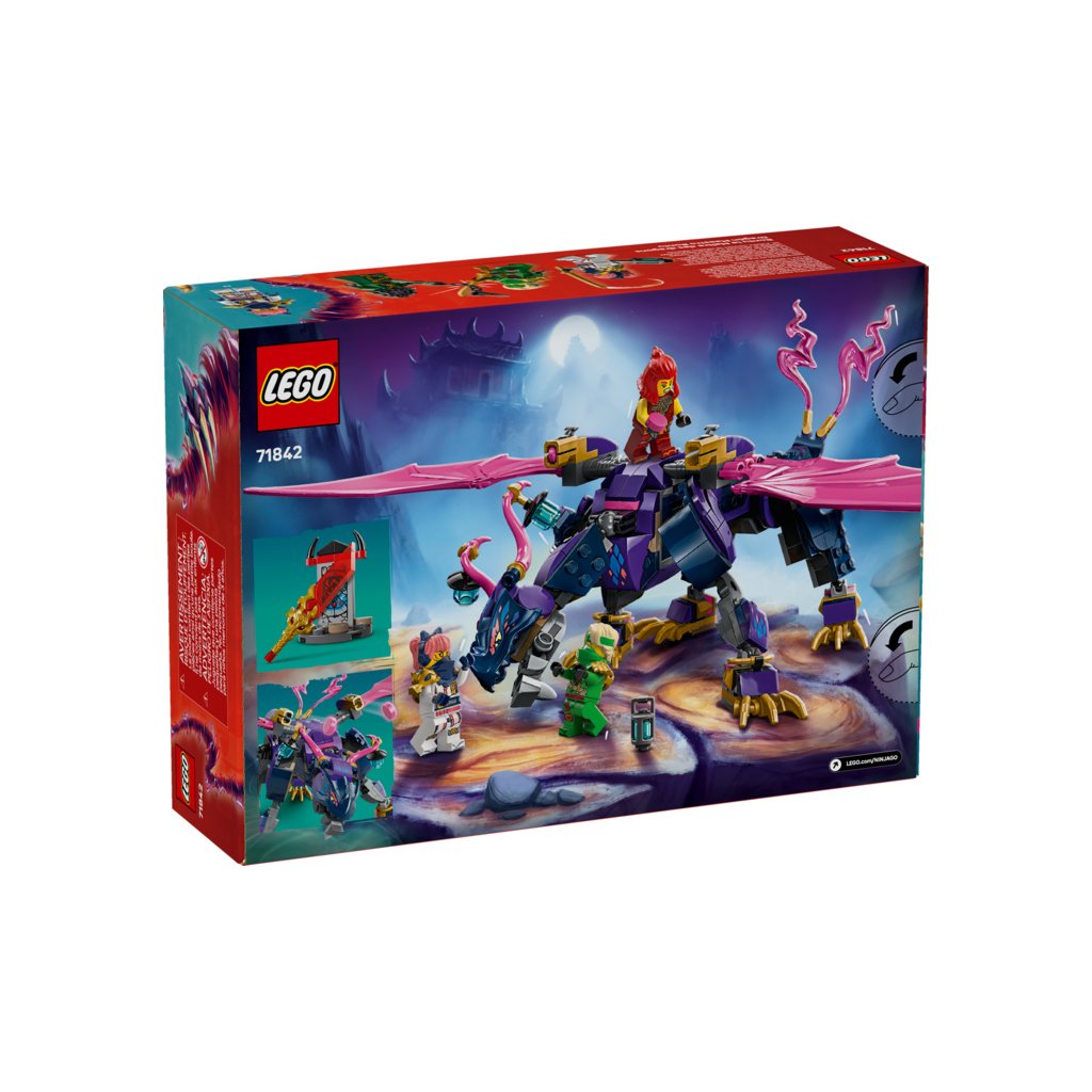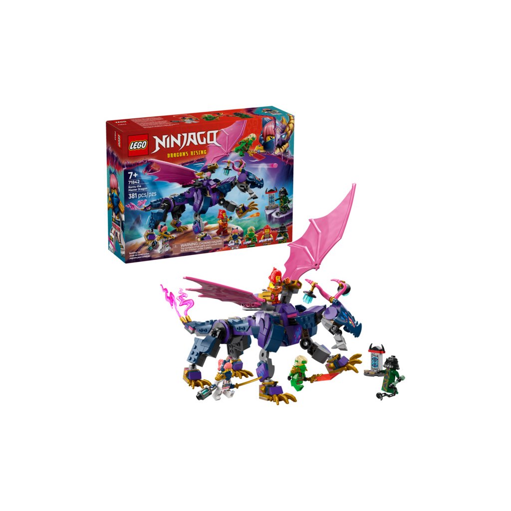 Se stavebnicí LEGO® NINJAGO® (71842) Rontu – Pán draků si fanoušci nindžů od 7 let připomenou akční scény z 3. řady televizního seriálu NINJAGO Dračí povstání. Tato stavebnice pro děti obsahuje model draka s pohyblivým ocasem, nohama, křídly, hlavou a čelistí, 2 pozicemi na zádech pro umístění minifigurky a vystřelovačem pod každým křídlem.