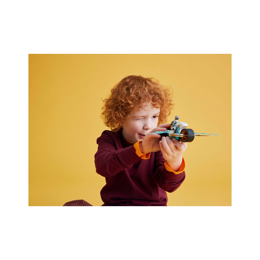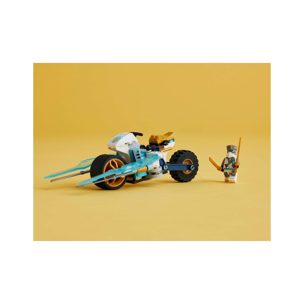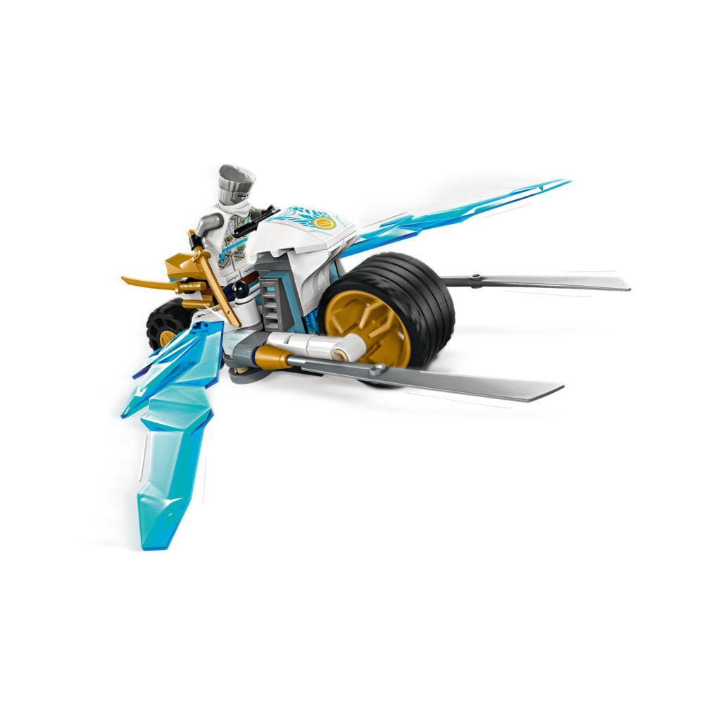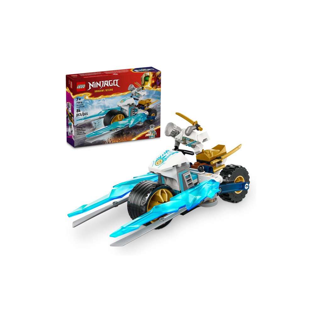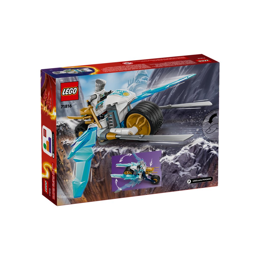 Stavebnice LEGO® NINJAGO® (71816) Zaneova ledová motorka umožňuje klukům a holkám od 7 let přehrávat si akční scény z 2. řady televizního seriálu NINJAGO Dračí povstání. Tato nindžovská stavebnice pro děti obsahuje motorku NINJAGO s pohyblivými koly, zlatými čepelemi a odpružením zadní pneumatiky. Když děti zatlačí na pneumatiku, na obou stranách se vyklopí parádní útočné ledové čepele.