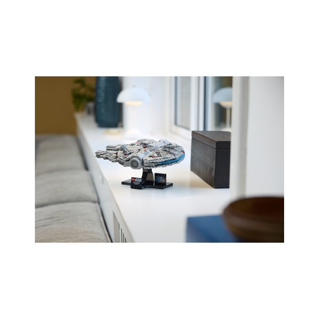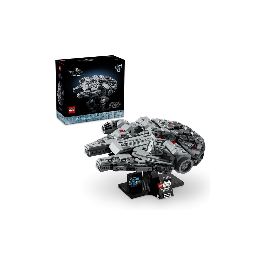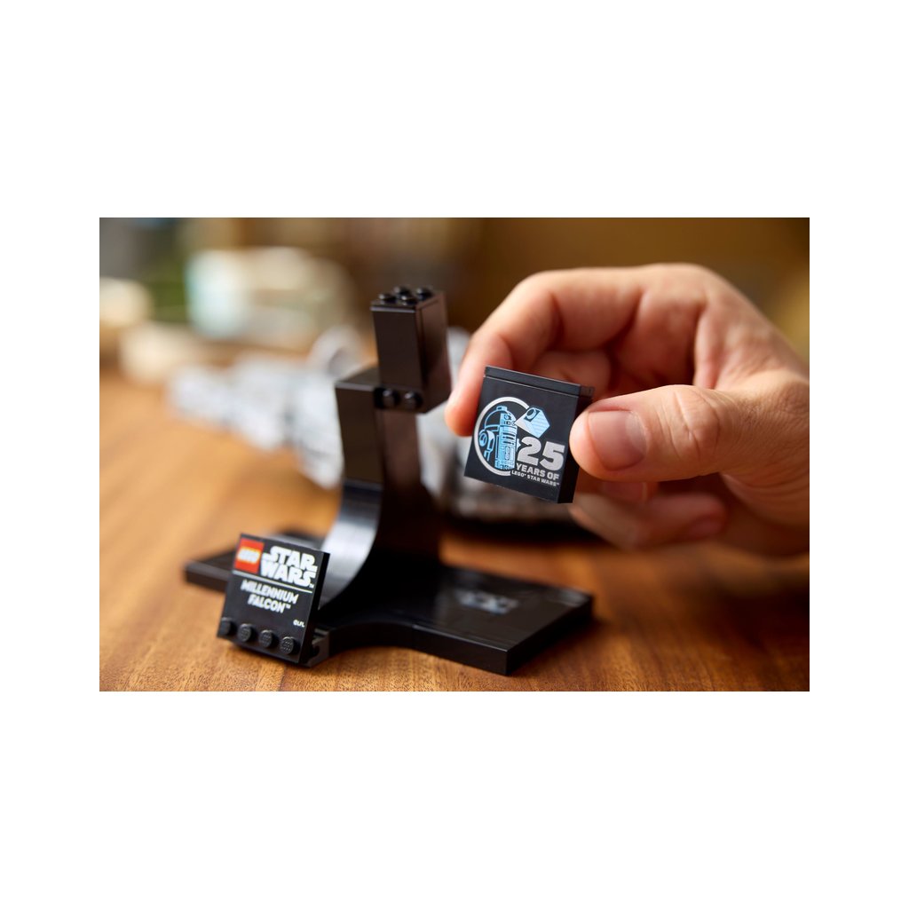 - Stvořeno na výstavku – Součástí je sestavitelný podstavec na vystavení modelu Millenium Falcon v dynamickém úhlu s cedulkou s názvem a kostka k 25. výročí LEGO® Star Wars™