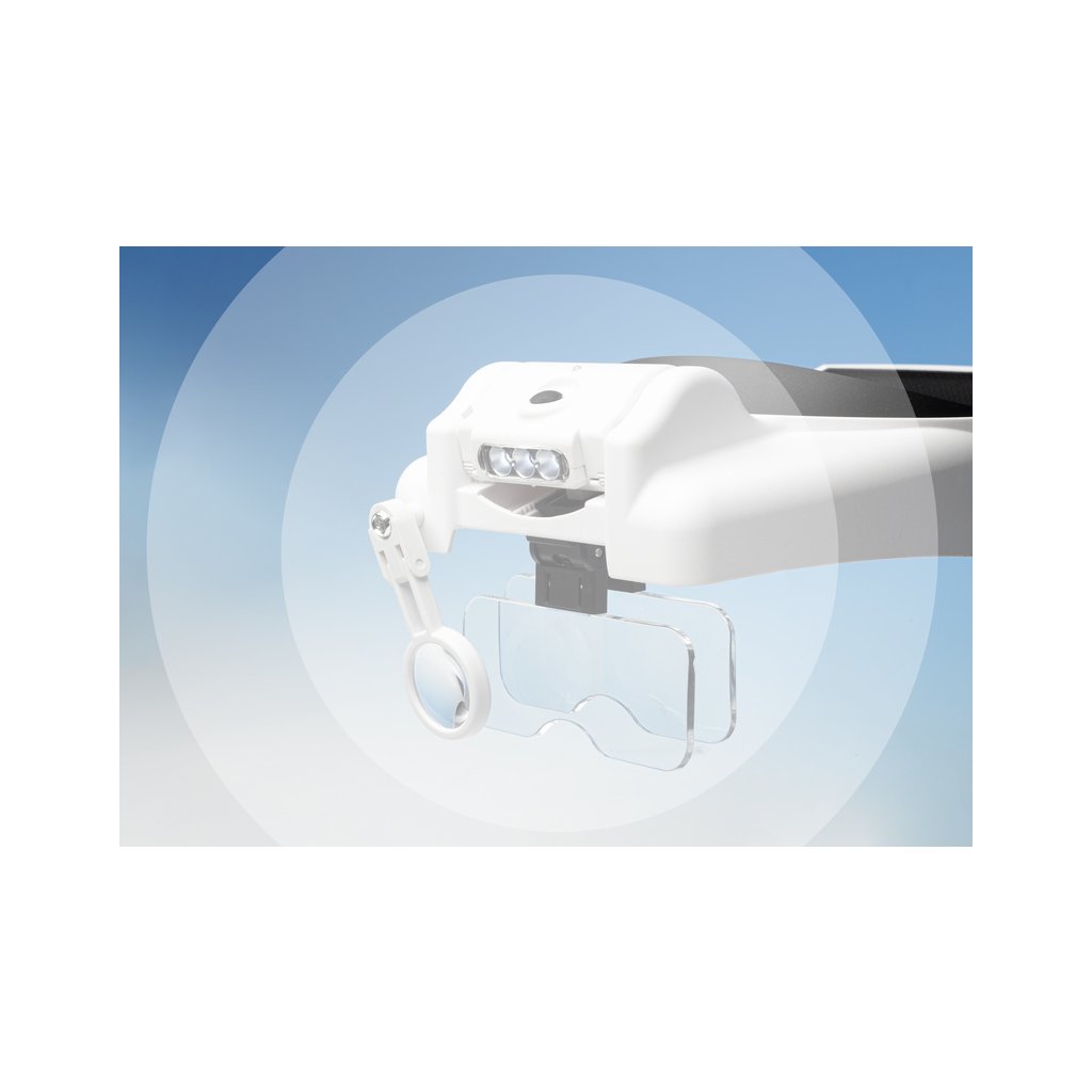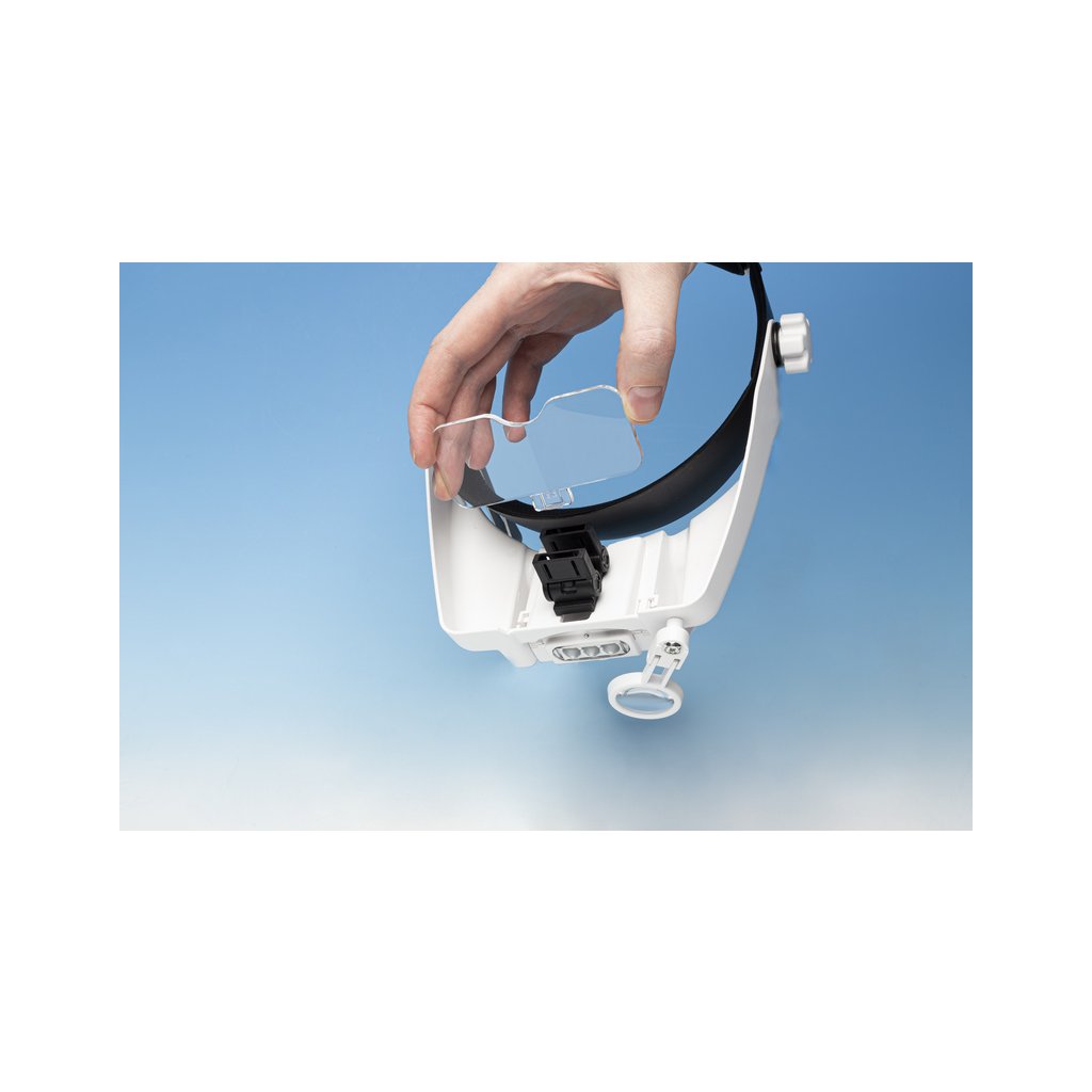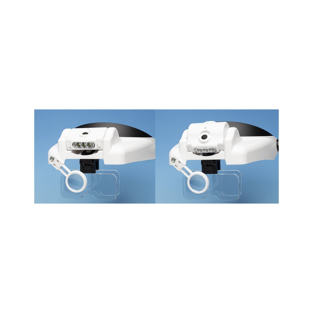 Speciální čelenka pojme dvě sady výměnný duálních objektivů, se kterými si můžete nastavit v kombinaci se třetí lupou na čelní straně čelenky 15 úrovní zvětšení od 1,0x až po 13,0x. V čelence je odnímatelné LED bodové světlo se dvěma úrovněmi jasu.