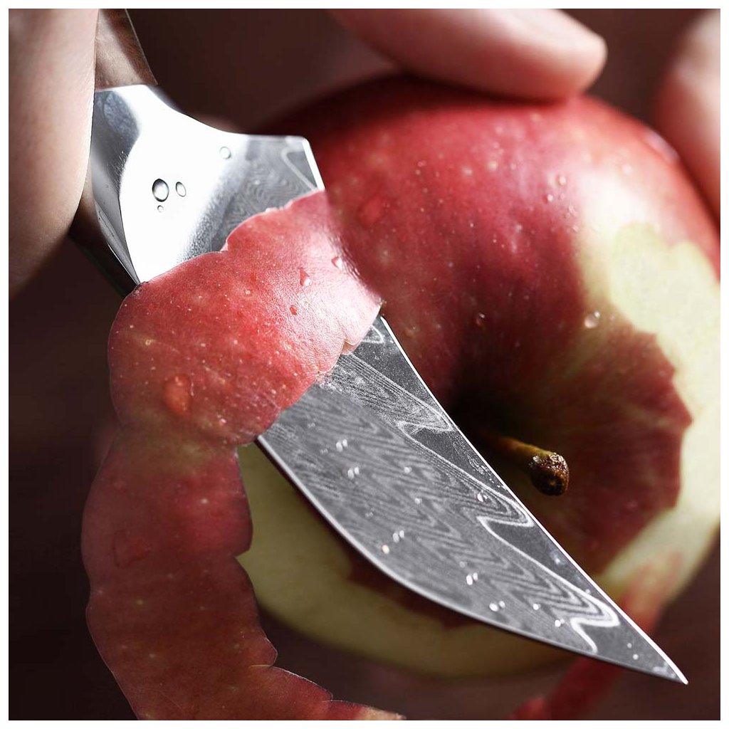 Tvar čepele na tomto noži připomíná japonský styl kiridashi menší univerzální čepel s ostrou špičkou, která je typická pro přesné a jemné řezy. Tento design se hodí pro různé detailní práce – od řezání drobných surovin, jako jsou bylinky nebo ovoce, až po přesné úpravy při porcování masa. Ostrá špička umožňuje přesné vedení řezu a kontrolu při práci. Takový tvar je oblíbený také pro různé řemeslné nebo outdoorové činnosti, kde je potřeba kombinovat pevnost a přesnost. Navíc díky damaškové oceli a celkovému tvaru působí nejen funkčně, ale i esteticky. Je to perfektní volba pro ty, kteří si cení detailu a preciznosti.