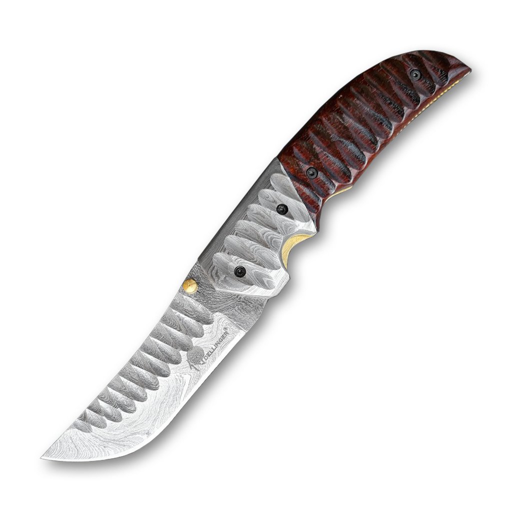 Zavírací nůž Dellinger Renoster s výrazně ostrou špičkou je vysoce odolný kapesní nástroj určený pro každodenní nošení i náročnou práci. Čepel je ukována z damaškové uhlíkové oceli. Vyšší obsah uhlíku zajišťuje výjimečnou tvrdost, odolnost a snadné dosažení extrémní ostrosti při broušení.