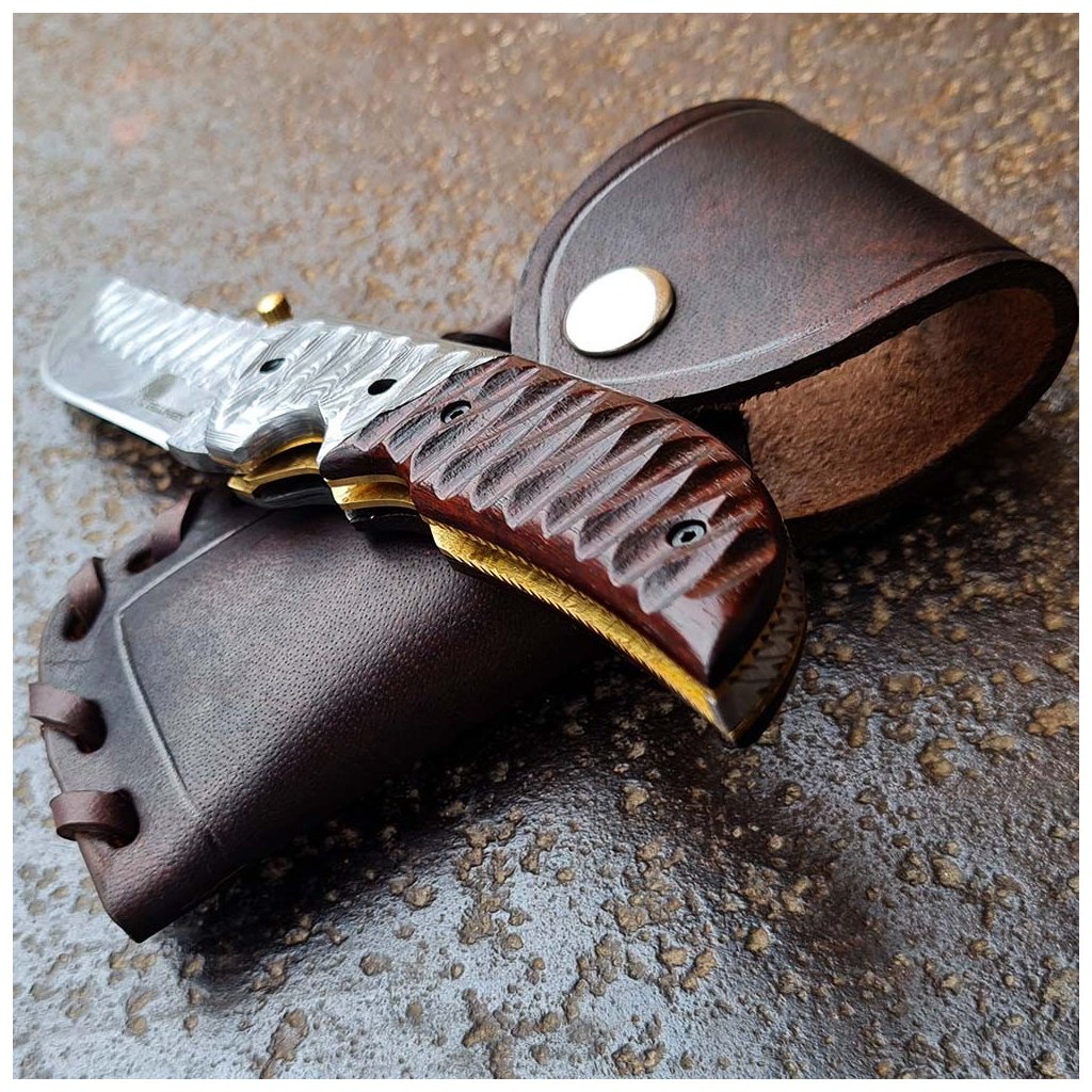 Vzhledem k charakteru oceli nůž není nerezový. Pro zachování jeho špičkového stavu je nutná pravidelná údržba – po použití čepel otřete do sucha a lehce ošetřete olejem, čímž předejdete vzniku koroze. Rukojeť z ušlechtilého palisandrového dřeva (Rosewood) a mosazi doplňuje masivní damaškové kování, které noži dodává luxusní vzhled. Tento praktický zavírák je dodáván v kvalitním koženém pouzdru.