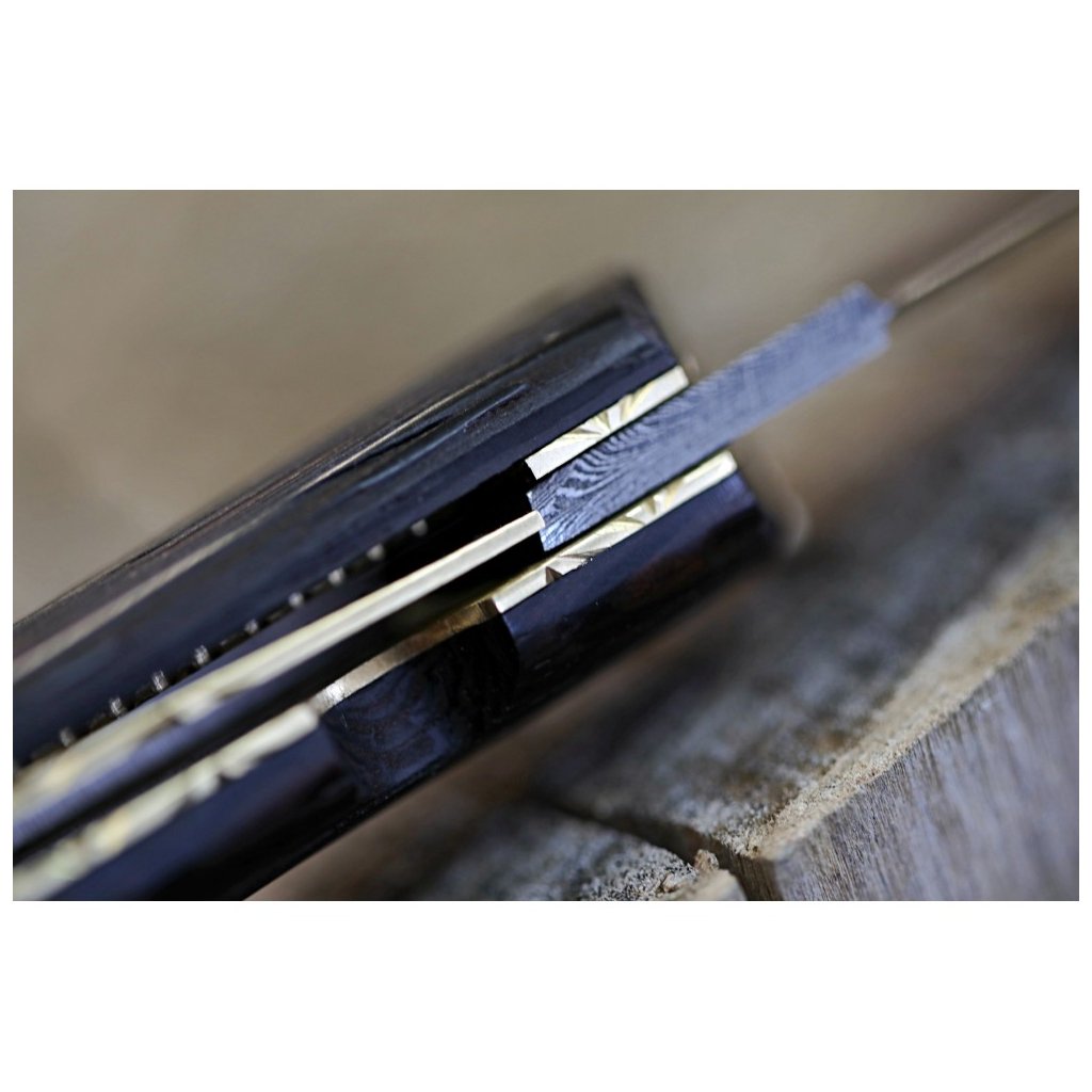 Jelikož se jedná o uhlíkovou ocel, nůž není nerezový. Vyžaduje proto pravidelnou péči – po každém použití je nutné čepel otřít do sucha a následně naolejovat, čímž minimalizujete riziko vzniku koroze a patiny. Rukojeť z tmavého tropického dřeva wenge vyniká svou unikátní strukturou a vysokou odolností. Tento praktický zavírák v sobě snoubí tradici damaškové oceli a moderní funkčnost. Součástí balení je kvalitní kožené pouzdro.