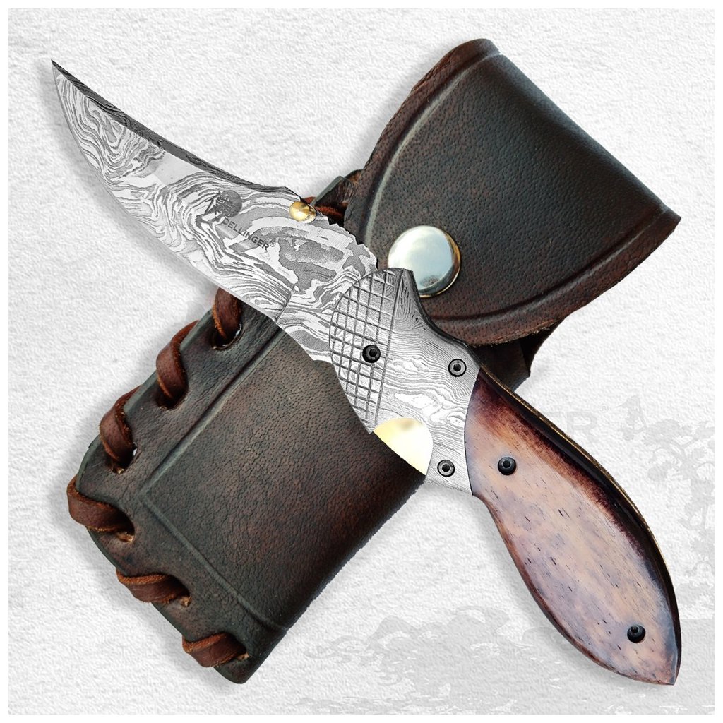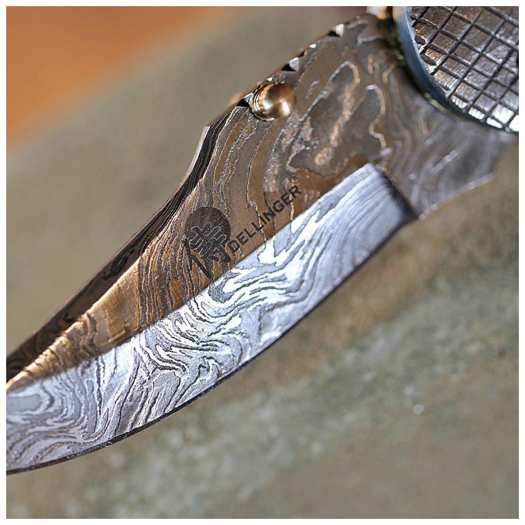 Zavírací nůž Dellinger Schnabel je exkluzivní kapesní nůž pro náročné uživatele a milovníky outdoorových aktivit. Jeho čepel je ukována z damaškové uhlíkové oceli, která díky vysokému obsahu uhlíku vyniká extrémní tvrdostí a odolností. Tento typ oceli se velmi snadno brousí do vysoké jedovatosti ostří.