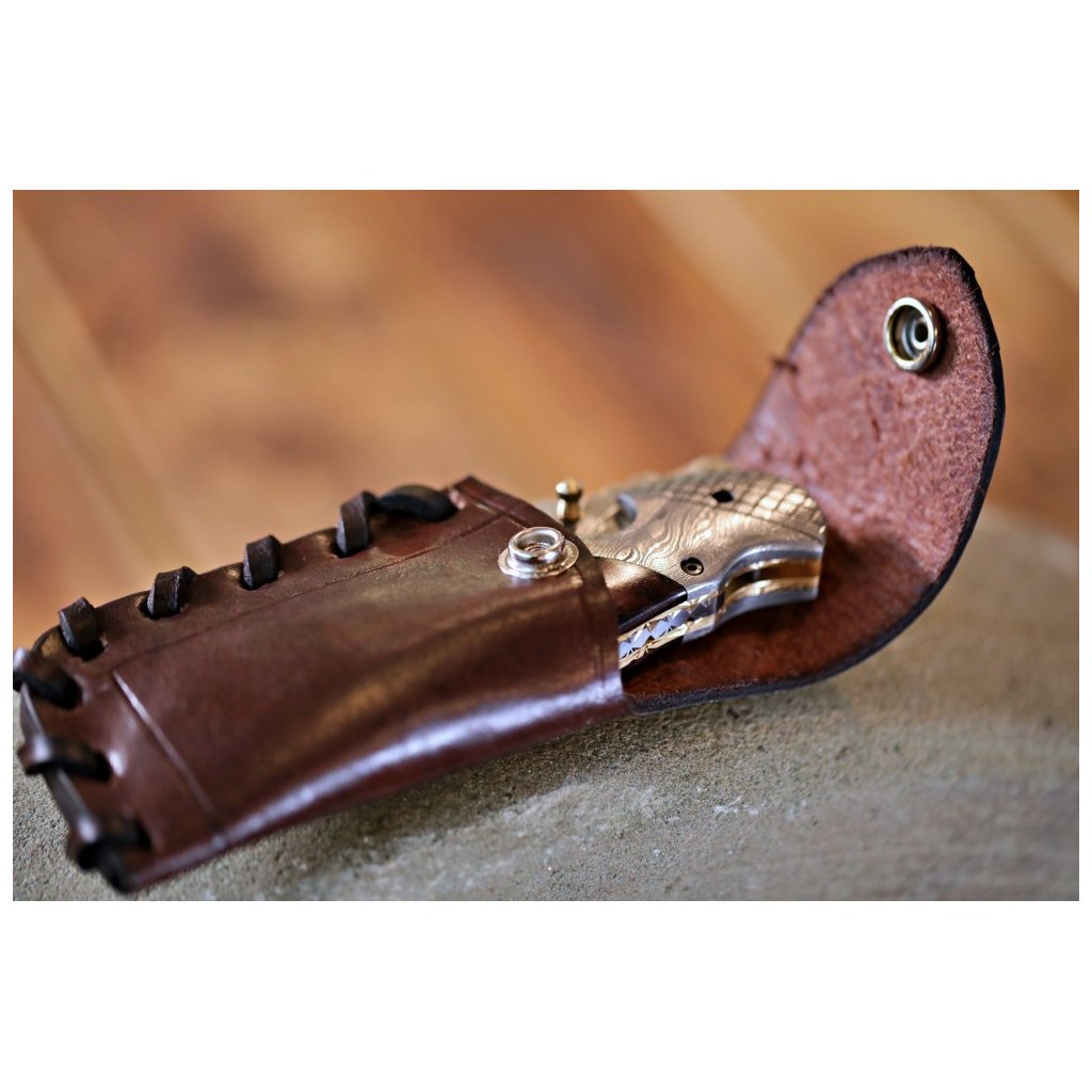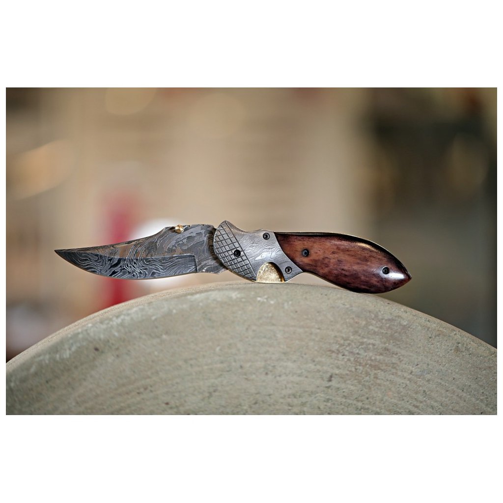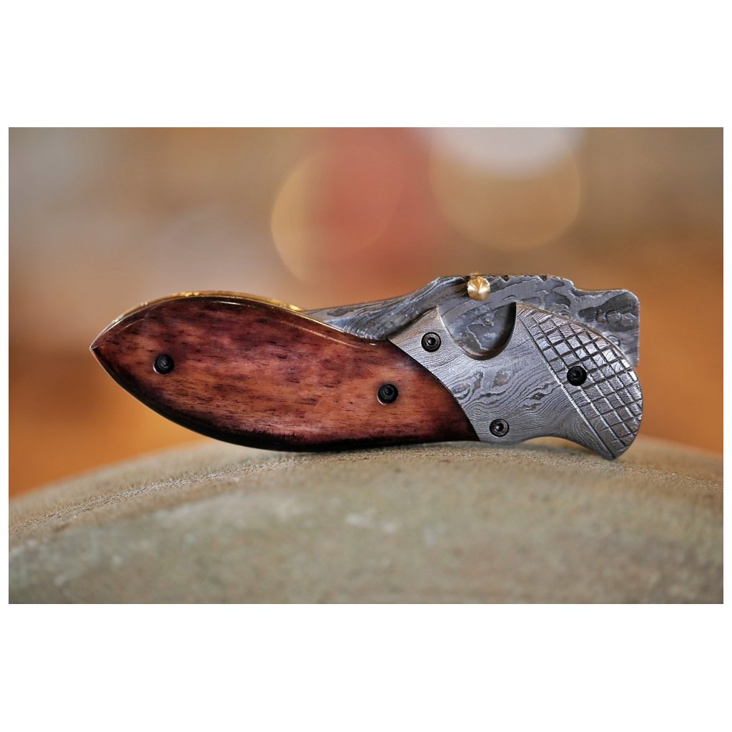 Jelikož čepel není nerezová, vyžaduje nůž náležitou péči – po každém použití jej otřete do sucha a ošetřete olejem, čímž ochráníte krásu damaškového vzoru. Rukojeť je mistrovským dílem kombinujícím barvenou velbloudí kost, mosaz a masivní damaškové kování s jemným rytím. O bezpečnost se stará spolehlivá pojistka liner-lock. Tento praktický a esteticky výjimečný zavírák je dodáván v koženém pouzdru.