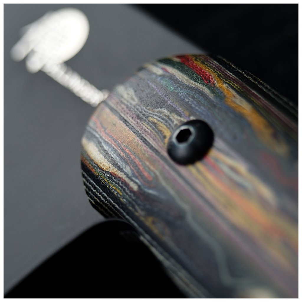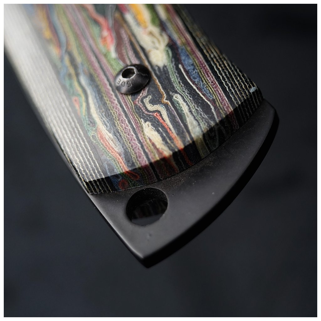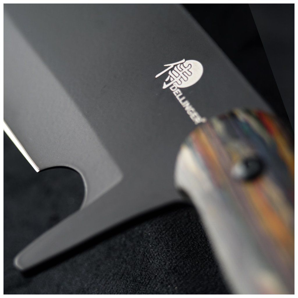 Mačeta Dellinger Ravenage s rukojetí z barevné Micarty je ručně kovaná a zpracovaná z oceli D2. Čepel mačety má povrchovou úpravu black stonewashed. Využít ji můžete jak v kuchyni na krájení a sekání zeleniny, masa a kostí, tak pro práce venku jako je kácení stromů, úprava zahrady nebo příprava dřeva pro oheň. Je to silný nástroj s dlouhou a širokou čepelí, což umožňuje provádět silné řezy a snadno pronikat do husté vegetace. Mačeta Dellinger Ravenage má na špičce čepele zaoblený konec, což umožňuje provádět sekání s rotačním pohybem.
