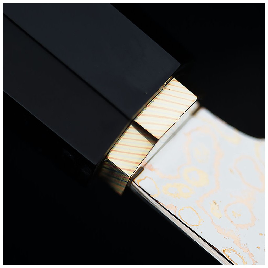Základem čepele je funkční jádro z vysoce kvalitní nerezové oceli 10Cr15CoMoV s vysokým obsahem uhlíku, které zajišťuje vysokou tvrdost, stabilitu ostří a dlouhodobou řezivost. Jádro je tepelně zpracováno na tvrdost přibližně 60 ±2 HRC, což umožňuje velmi ostré broušení v úhlu 9–12° na stranu při zachování mechanické odolnosti při každodenním použití. Na toto jádro jsou následně řízeně nanášeny vrstvy nerezové oceli a mědi (cuprum), čímž vzniká charakteristická damašková struktura. Na rozdíl od klasického damašku zde vzor nevzniká skládáním a překládáním ocelí, ale precizním vrstvením kovů s rozdílnými fyzikálními a chemickými vlastnostmi. Měď se nepodílí na samotné funkci ostří – její úloha je primárně vizuální a strukturální v povrchových vrstvách, kde vytváří typické zlatavé linie a neopakovatelnou kresbu. Pro zvýraznění struktury damašku nejsou tyto čepele upravovány chemickým leptáním, ale mechanickou metodou pískování. Jemný proud abrazivních částic selektivně odstraňuje měkčí vrstvy materiálu a přirozeně odhaluje vnitřní strukturu oceli. Výsledkem je jemně matný, hedvábně lesklý povrch, který je nejen vizuálně atraktivní, ale také vykazuje vyšší odolnost vůči korozi, opotřebení a mechanickému poškození, a to bez použití chemikálií. Sendvičová konstrukce zároveň přispívá k lepšímu rozložení pnutí v materiálu. Kombinace tvrdého jádra a houževnatějších vnějších vrstev snižuje riziko vzniku mikroskopických trhlin a zvyšuje stabilitu čepele při dynamickém zatížení během krájení.