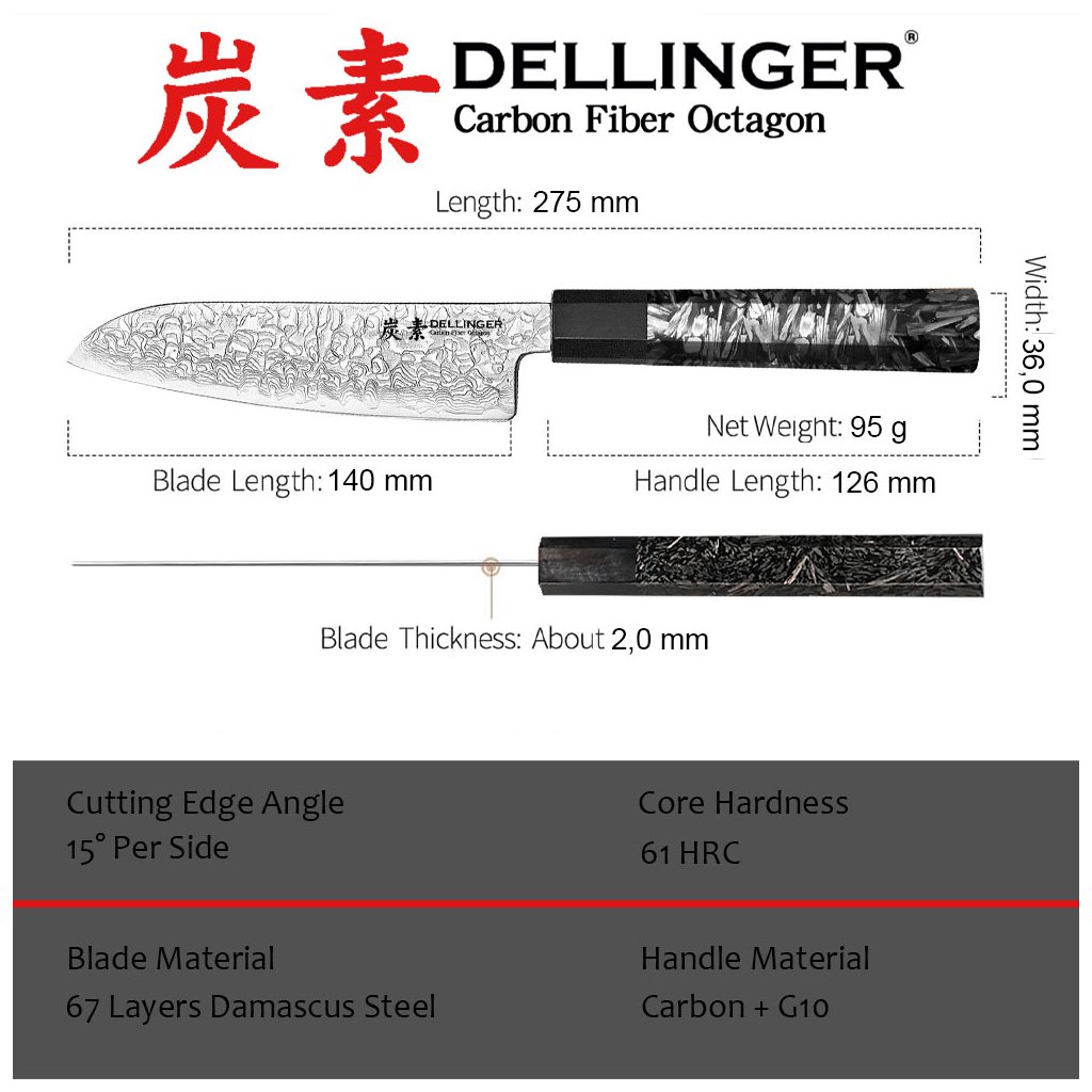 Nože ze série Dellinger Carbon Fiber Octagon jsou vizuálně ohromující, neuvěřitelně lehké a skvěle padnou do ruky pravákům i levákům. Každý kuchař ocení nejen jejich výjimečný design, ale i perfektní ergonomii osmihranné rukojeti.