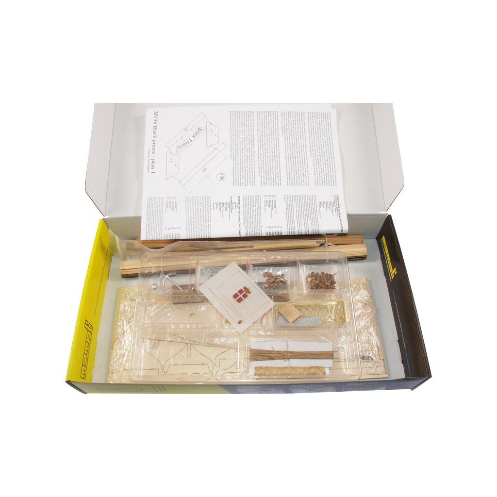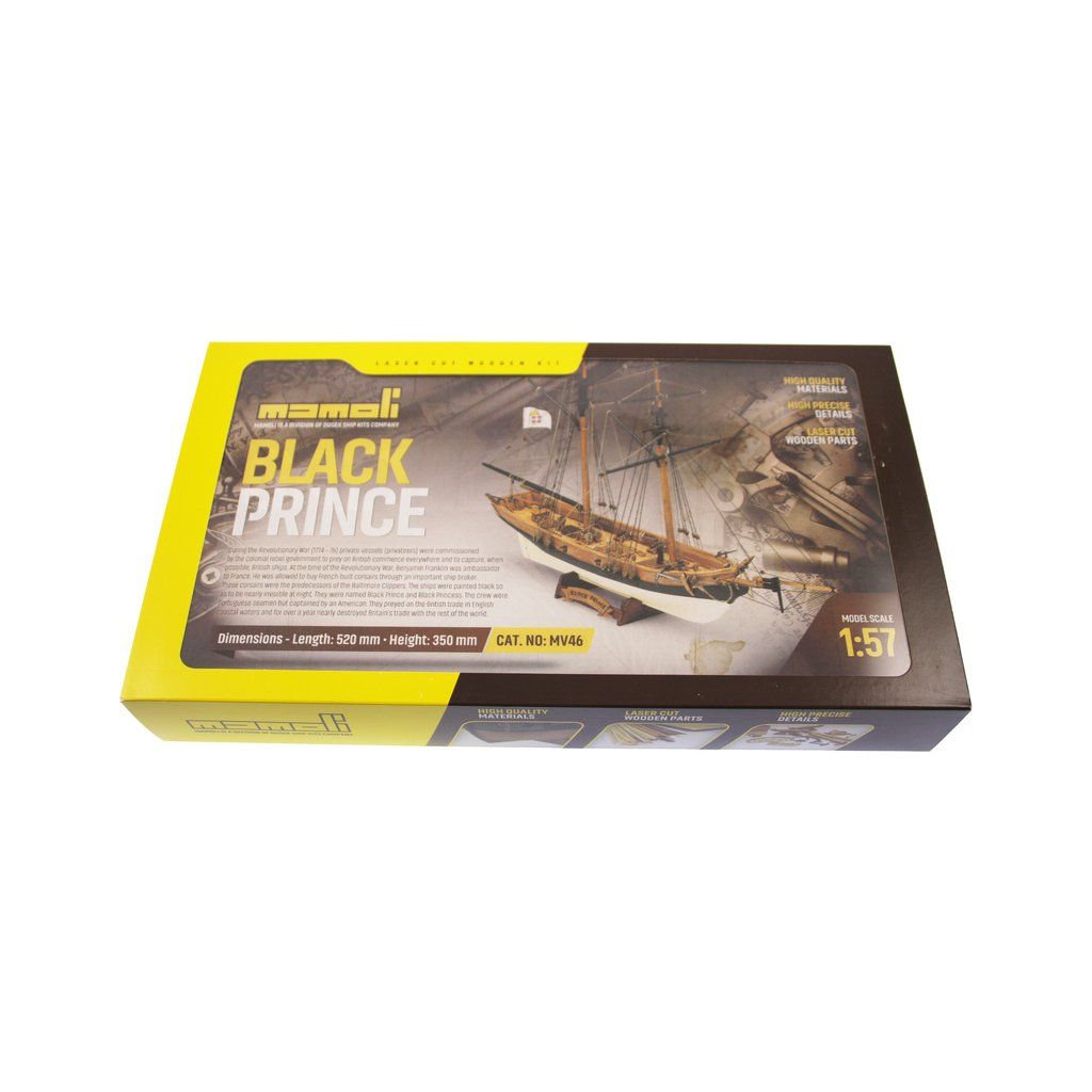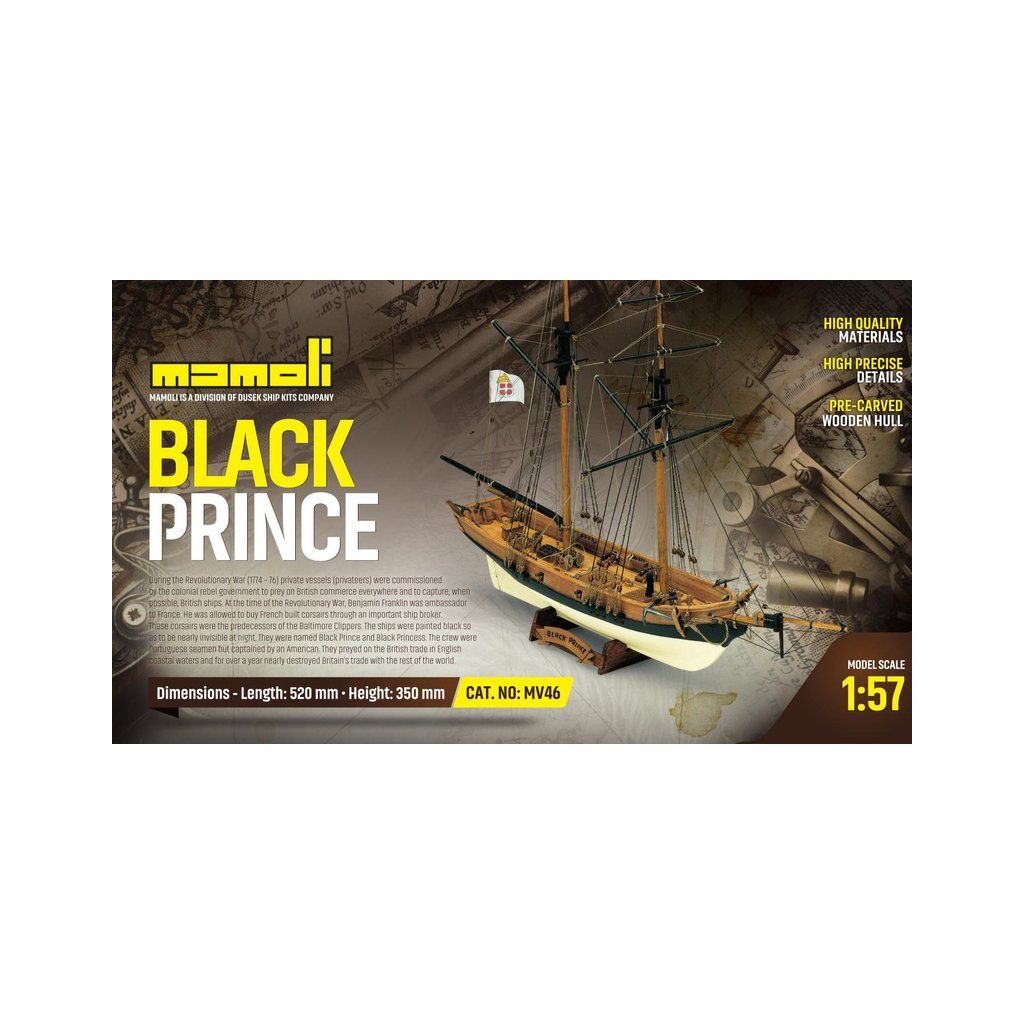 Stavebnice neplovoucího modelu MAMOLI Black Prince v měřítku 1:57 z roku 1774. Loď z období války za nezávislost. Benjamin Franklin byl v té době velvyslanec ve Francii a tam lodě zakoupil. V balení stavebnice jsou dřevěné díly, lišty a množství kování, lanoví, plány a český návod.
