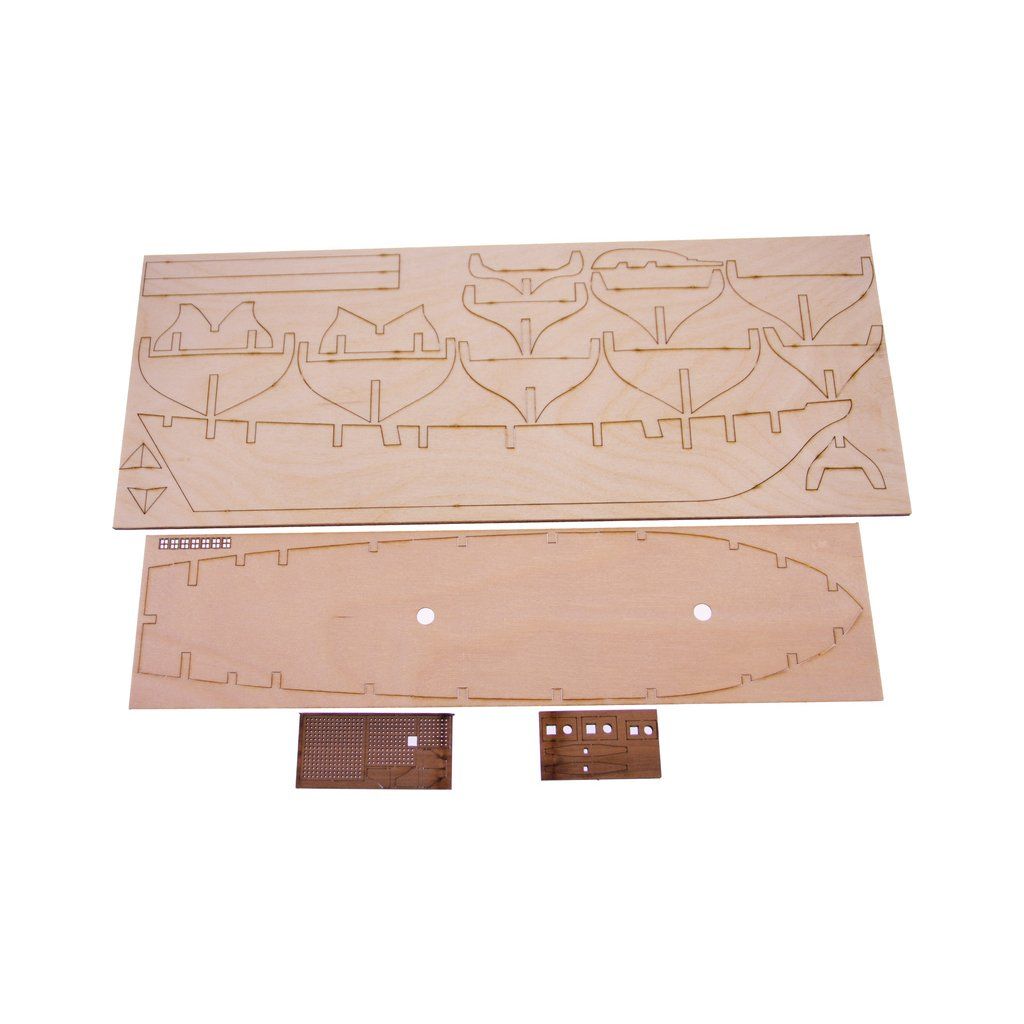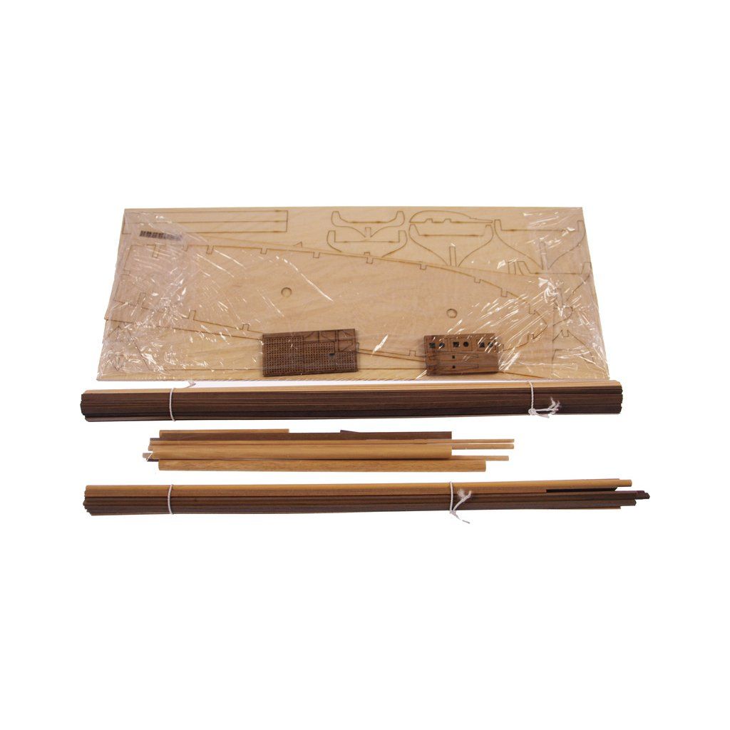 Balení obsahuje hotový polotovar trupu, překližkové díly, dřevěné lišty, blistr s drobnými díly, sadu výkresů a český návod.