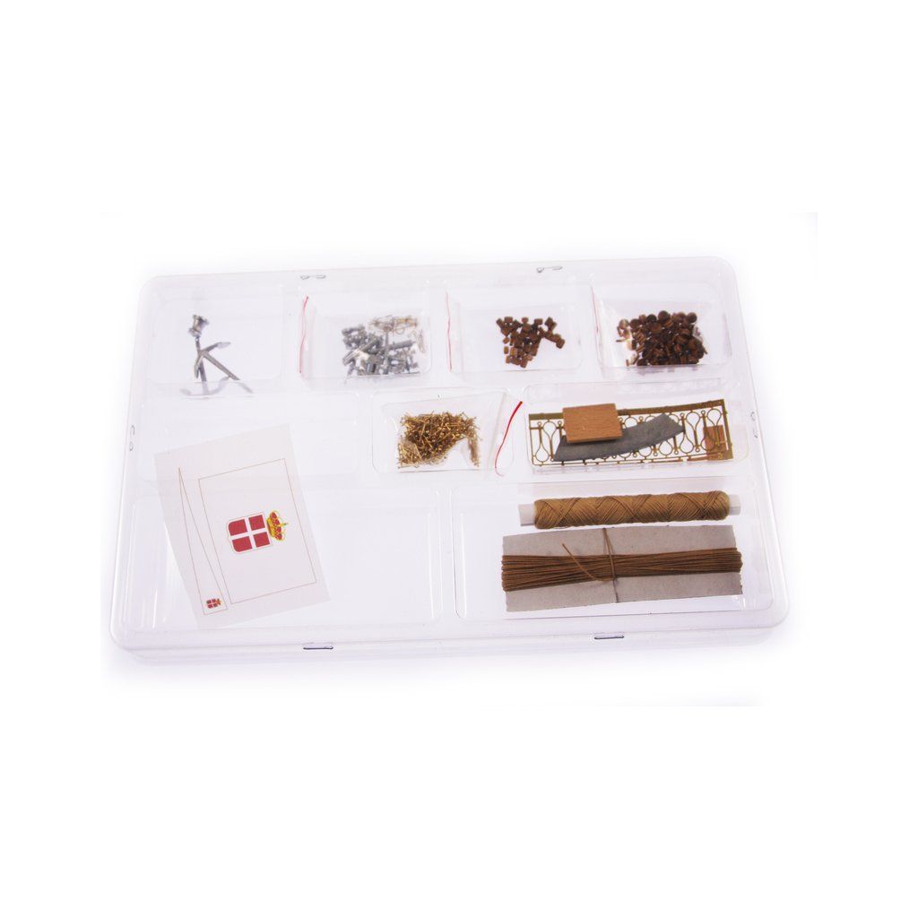Po otevření víka krabice naleznete dřevěné díly modelu, drobné součásti uzavřené v plastovém průhledném blistru a sadu výkresů.